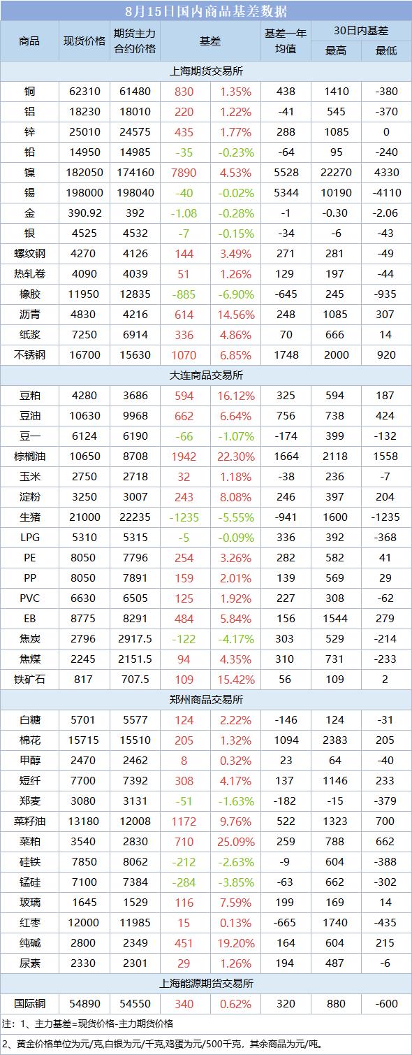 基差报告:8月15日国内商品基差数据一览