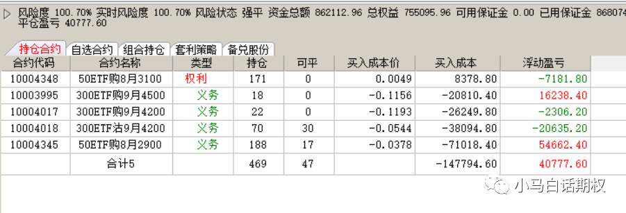 有的朋友,由于之前股票、期货投资等亏损过,对风险极度厌恶,或者曾经期权赚过大钱,有过曾经适用于当时行情的策略,但是时代是在变化的。比如有朋友很沉稳,观察别人使用卖跨策略,2016年赚了100%(那时候波动率比较高),但他确实观察了一年没下手,等别人赚了100%后开始使用这个策略,当然在2017年同样是低波动率时期,4个月也赚取了近20%的收益,但是5月份风向变了,标的开始大幅上扬,他坚持自己的卖跨策略,面临的就是不断止损,亏钱是小事,双向交易的期权,没赚到钱那才是大事。然后他看我和其他人单腿认购赚钱,又没下手观察了好几个月,最后在涨了三个月后下手买购,刚好碰上8月份的回调,折戟沙场,然后亏了两个月又回到了卖跨策略,结果又碰上10-11月的单边上扬行情,再次被打脸,不断止损。而且,他无法承受权利仓那巨大的波动,还是比较习惯义务仓那每月1-3%的波动。 简单的说,要拒绝刻板的坚持只有在一些行情中才适用的策略,没有一招鲜的行情,及时的更改策略,才能不每次都挨打。