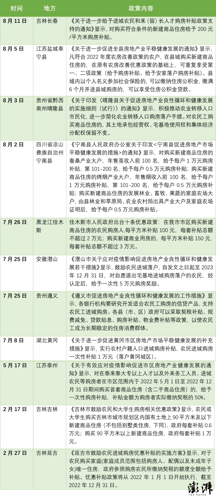 | 释放农民消费潜力、鼓励农民进城购房再次成为全国多地推动楼市发展的一大举措。 据澎湃新闻不完全统计,今年以来,至少包括吉林省延吉、吉林省吉林、江苏省泰州、湖北省黄冈、贵州省遵义、安徽省潜山、黑龙江省佳木斯、吉林省长春等城市以及四川省凉山彝族自治州宁南县、贵州省黔西南州晴隆县、江苏盐城阜宁县等地出台鼓励农民进城购房的相关政策。 同时,可以看到,在出台鼓励农民进城购房的城市中,地方政府多给予购房补贴、契税补贴等优惠政策。 ![]() 多地财政补贴,支持农民进城购房 以吉林省长春为例,今年8月11日,长春市住房保障和房屋管理局发布《关于进一步给予进城农民和来(留)长人才购房补贴政策支持的通知》。《通知》显示,对购买符合条件的新建商品住房给予200元/平方米购房补贴。 按照要求,申请人与房地产开发企业签订的正式商品房买卖合同网签备案时间在2022年8月1日至10月8日之间;所购房屋需坐落在长春市主城区及开发区国有土地上,不含双阳区、九台区及各县(市);房屋建筑面积在90平方米以下;房屋性质仅限新建商品住房,不包括商业、办公等非住宅类房屋、别墅、保障性住房以及二手住房;所购房屋需为申请人个人首套唯一住房。 除了长春市,吉林省多个城市亦发布相关政策,包括延吉市、吉林市等。 其中,延吉市明确,对于农民购买家庭(家庭成员范围包括购房人、配偶以及未成年子女)唯一住房,政府参照购房农民所缴纳契税的额度全额给予补贴。 吉林市的政策显示,农民或大学生购买吉林市城市规划区内国有土地上90平方米及以下新建商品住房(不包括别墅类住房,下同),政府每套补贴0.6万元;购买90平方米以上新建商品住房,政府每套补贴1万元。 另据《佳木斯日报》报道,今年7月26日,佳木斯市人民政府出台十条优惠政策,其中提及农民进城购房补贴。在佳木斯市市区购买新建商品住房的农民购房人,每平方米补贴100元,每套补贴总额不超过2万元;购买新建商业用房的,每平方米补贴150元,每套补贴总额不超过3万元。 湖北黄冈出台的《关于进一步促进黄冈市区房地产市场平稳健康发展的补充措施》明确,实行农村户籍人口进城购房补贴,农民进城购房一次性补贴1万元(落户黄冈城区)。 诸葛找房数据研究中心高级分析师陈霄指出,近期以来,多城发布鼓励农民进城购房的政策,如遵义、盐城阜宁县以及长春等,出台的政策内容多为提供购房补贴和优惠等形式,从出台的城市来看,以一些库存压力大、去化困难的弱二线和三四线城市为主,出台这样的政策也是为了增加购房需求,缓解库存压力,提振市场信心。将政策聚焦于农民这样庞大的群体,有利于提升农民进城置业的积极性,一定程度上能带动一部分需求释放。 鼓励农民进城购房对楼市效果大吗? 可以看到的是,鼓励农民进城购房并非此次楼市调控的新鲜产物。 早在2015年底,中共中央政治局召开会议,会议提出,要化解房地产库存,通过加快农民工市民化,推进以满足新市民为出发点的住房制度改革,扩大有效需求,稳定房地产市场。要扩大有效供给,保持有效投资力度,着力补齐短板。 在彼时“去库存”的大背景下,加快农民工市民化,鼓励有条件的农民工买房成为重要措施。 按照新华网2016年2月发布的文章,当时山西、山东、甘肃等省明确出台政策鼓励引导农民进城购房。如山东将对农民进城购房给予契税补贴、规费减免、贷款贴息、物业费补贴等政策,以使其成为长期稳定的住房消费群体。 2016年2月19日,中国农业银行还曾推出“农民安家贷”产品,该产品是国内首个专门针对农民群体的个人住房贷款产品,致力于满足广大农民进城购买商品住房的需求。 从效果来看,根据新华网报道,截至2016年7月31日,安徽农行“农民安家贷”实现发放23329笔,发放金额69.91亿元,帮助农民进城购房。 安徽地区房地产“去库存”效果也得以凸显。以六安市为例,2015年市区待售商品房面积达663万余平方米,2016年一季度,六安市区销售商品房120多万平方米,同比翻了一番,其中农民购房占比超过50%,去化周期由28个月缩短到18个月。 在58安居客房产研究院分院院长张波看来,2016年大量三四线城市开始去库存,就已经消耗了大量的农民在县城的买房需求,同时前几年返乡置业更是吸引了一大批在三四线老家买房年轻人的购房需求。因此,本轮的鼓励农民进城买房能够有效吸引到的购买力和几年前相比已大大减少。 张波指出,前一轮去库存后,由于三四线城市也紧随出现房价上涨,最终导致市场的热度明显上升,并带动房企在中小城市拿地热情同步上扬,所导致的结果就是三四线城市的库存量又呈现上升态势,加之市场降温的大背景,导致去化出现困难,鼓励农民买房就是为了拉升需求并加速去化。 张波认为,农民进城买房的需求依然存在,内在推动因素包括对于优质教育资源的追求,对于更好公共配套资源的需求,但本轮政策对于农民推动的实际效果将低于市场预期。 陈霄也认为,从效果来看,可能实际作用有限,一方面农民进城多是短期务工,并且在农村也有固定居所,有限的优惠补贴力度尚难以触达农民,另一方面,三四线城市需求基本已经透支,通过这样的政策能增加的需求有限。 《经济日报》发布的评论文章指出,近期,我国部分城市推出鼓励农民进城买房的政策举措,多个市县提出给予购房