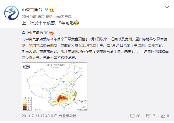中央气象台发布今年首个干旱黄色预警