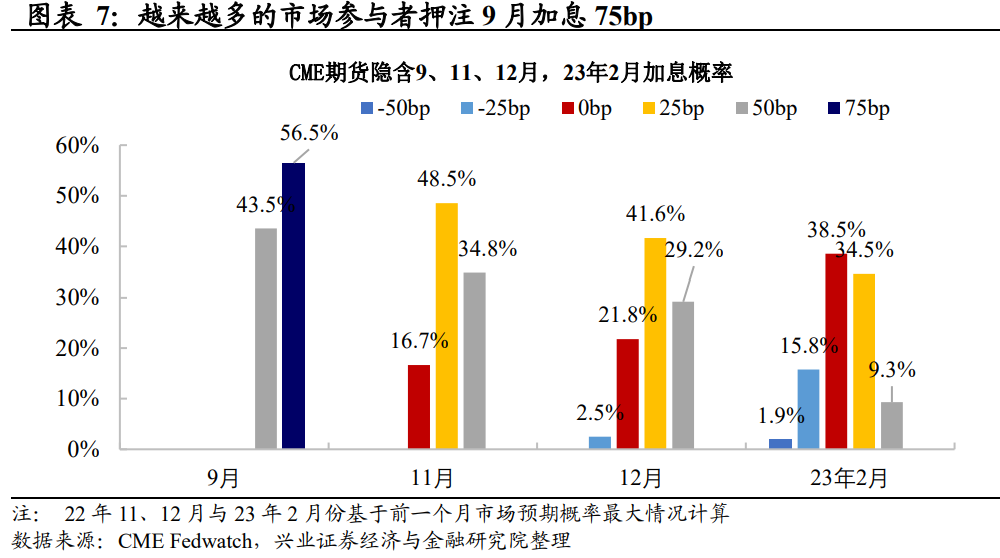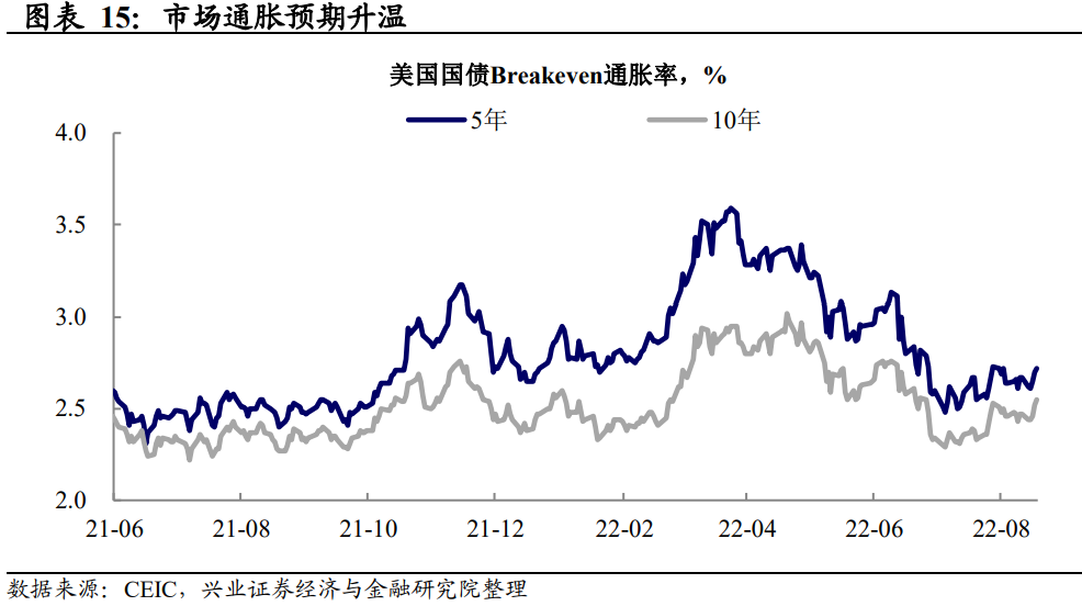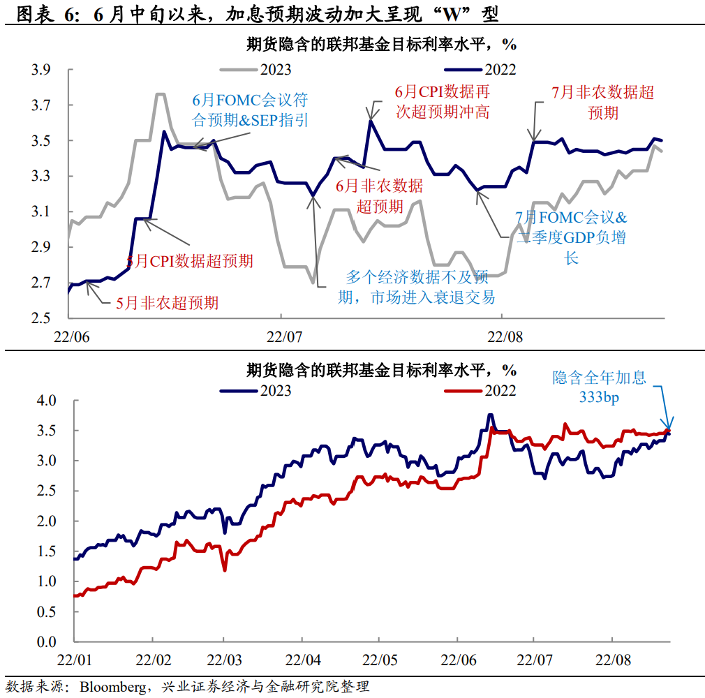 ![]() ![]() ![]() ![]() ![]() 心动vs幡动:变化的是市场对宏观逻辑的解读 宏观逻辑的转折并非8月初发生的,只是市场的解读开始发生变化。“衰退交易”的演绎,确实有部分宏观数据支撑:美国二季度GDP增速转负、实际个人消费支出同环比二季度均进入负值区间、企业库存变动斜率显著放缓、地产市场也出现降温、7月CPI读数也伴随着油价降温自9.1%回落至8.5%;但不可忽视的是,另一部分数据似乎并未刻画“衰退”图景:这其中最为代表的就是依然非常强劲的是就业数据。基于此,如果我们去观察联邦基金期货利率所反映的加息预期,可以发现市场是非常“纠结”的:6月FOMC会议以来,市场预期的2022年底联储加息的终点在3.2%至3.6%区间波动(年内再加175bp至200bp),整体走了一个“W形”。有意思的是,在加息预期波折的过程当中,资产价格(尤其是美股)似乎对一些支持紧缩的负面信号“视而不见”。 ![]() ![]() 数据“左右互博”,如何判断联储路径,以下几条逻辑或能供参考: (1)整体通胀预期6月见顶,但供给端不确定性仍存。近期释放的伊核协议可能恢复的信号无疑是助推油价降温的重要动力。但值得玩味的是沙特的表态:8月23日,沙特能源大臣指出原油期货价格并未反映潜在的供需基本面,OPEC+在下个月开会考虑产量目标时可能会进行减产。此外,欧洲近期天然气价格和电价快速上升,中国部分省市也出现限电的情况。需要持续关注地缘博弈在能源和粮食供给端的扰动,高温和原材料短缺对欧洲生产进而对全球供应链的扰动。 (2)美国经济下行是大概率事件,因而联储最终转向也是大概率事件。前者的核心逻辑是,美国经济正面临着紧缩、通胀和财政的三重冲击。10年和2年期美债利率倒挂幅度接近50bp,这已经接近科网泡沫时期低点,10年期和3个月美债利率也接近倒挂,这都说明了市场对经济继续降温的高度担忧。关于高通胀vs低增长,联储依然在衰退周期中依然会侧重后者,我们从1970年代沃尔克的操作中可以窥见端倪。 (3)但当前可能还没到联储态度转折的绝对拐点。