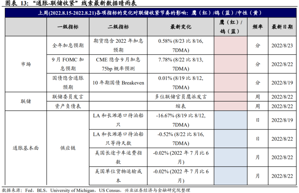 ![]() ![]() ![]() 基于此,重读联储近期信号,实际是对前期过于乐观市场的一种“纠偏”。7月FOMC纪要当中联储强调:“一段时期低于趋势的 GDP 增长(below trend economic growth)将有助于减轻通胀压力,并为持续实现委员会的最大就业和价格稳定目标奠定基础”、“转向适当的限制性政策立场对于避免通胀预期脱锚至关重要”以及8月中旬以来联储票委要加息75bp的放风,其实都是在纠正市场此前对其态度过于乐观的解读。 因此,市场近期调整也是在逐步和再审视这一信号。美债从8月开始就出现转折,美股在中报季接近尾声、8月19日美股期权大量到期之后波动放大,可能意味着市场开始接受逻辑的变化,甚至提前定价鲍威尔在本周五(8月26日)Jackson Hole 全球央行年会上可能偏鹰的发言。 ![]() ![]() 展望:事情变得更好之前可能会先变差 展望未来,在联储释放明确转鸽信号前,美国股债市场调整都尚未结束。7月联储放弃前瞻指引之后,其实在等待的是来自劳动力市场的进一步信号。9月联储是否会加息75bp、联储何时会释放边际转松的信号,需要关注的时间点,可能依次是本周五(8月26日)联储主席鲍威尔在Jackson Hole 全球央行年会上的发言、下周五(9月2日)的非农数据和9月13日的美国CPI数据。 附:“通胀-联储收紧”线索追踪 ![]() ![]() ![]() ![]() ![]() 通胀:供应链压力持续缓解,运输成本下降 ![]() ![]() ![]() ![]() 风险提示:通胀持续性超预期,美联储货币政策超预期。 (文章来源:兴业证券) (责任编辑:admin) |