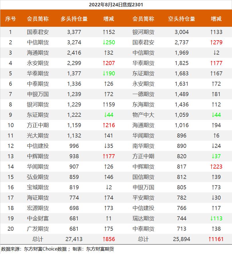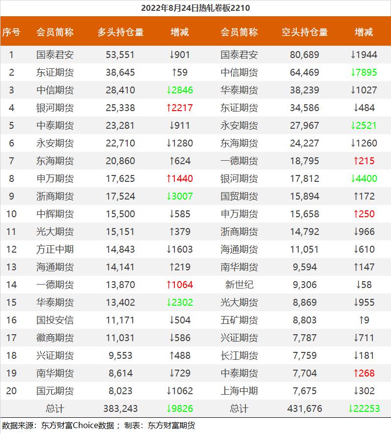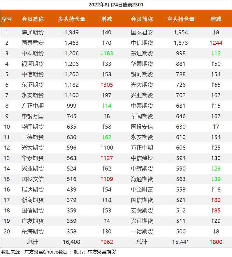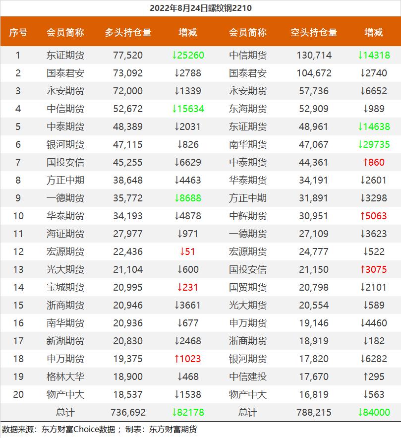 | 截至8月24日收盘,螺纹钢2210收4086/吨,涨1.52%;热卷2210收4008元/吨,涨1.98%;铁矿石2301收716元/吨,涨2.65%;焦炭2301收2589.5元/吨,涨0.27%;焦煤2301收1948元/吨,跌0.41%。 螺纹钢2210合约前20席位多单减仓82178手至73.6万余手,空单减仓84000手至78.8万余手,整体净空51523手。其中中信期货多单减持15634手,空单减持14318手,整体净空78042手。 各品种具体如下: ![]() 各品种持仓情况具体如下: ![]() ![]() ![]() ![]() ![]() (文章来源:东方财富研究中心) (责任编辑:admin) |