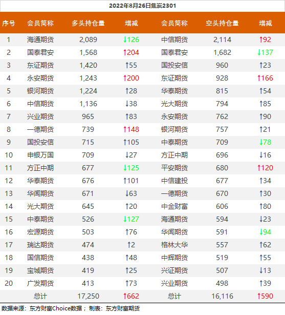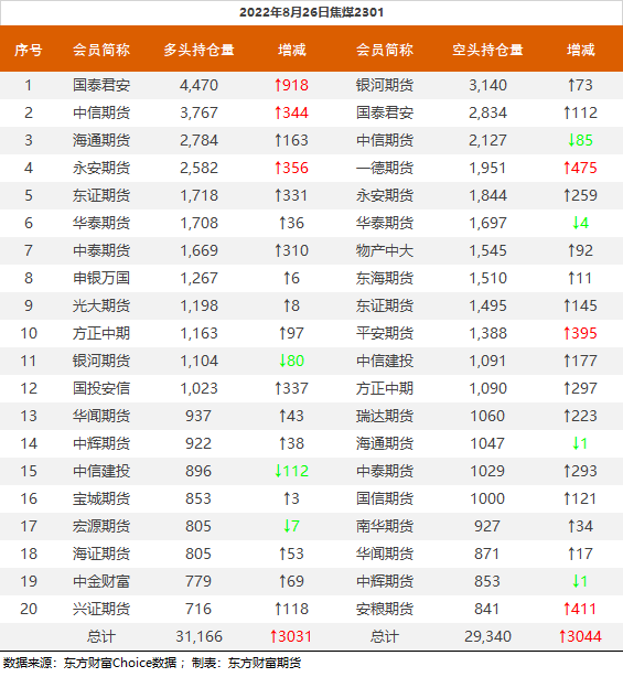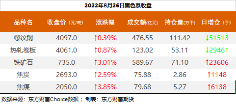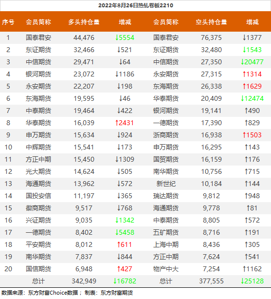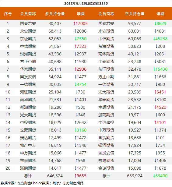 | 截至8月26日收盘,螺纹钢2210收4097/吨,涨0.39%;热卷2210收4061元/吨,涨0.87%;铁矿石2301收735元/吨,涨3.01%;焦炭2301收2693元/吨,涨2.59%;焦煤2301收2050元/吨,涨3.85%。 螺纹钢2210合约前20席位多单增仓9655手至64.6万余手,空单减仓63400手至65.3万余手,整体净空7550手。其中国泰君安期货多单增持17005手,空单减持8629手,整体净空14170手。 各品种具体如下: ![]() 各品种持仓情况具体如下: ![]() ![]() ![]() ![]() ![]() (文章来源:东方财富研究中心) (责任编辑:admin) |