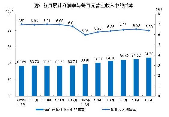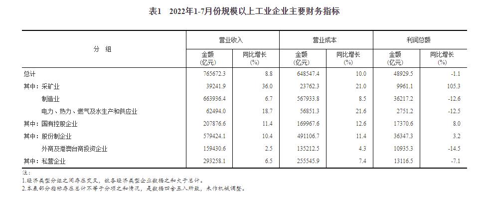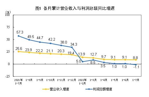 统计局:2022年1-7月份全国规模以上工业企业利润下降1.1%