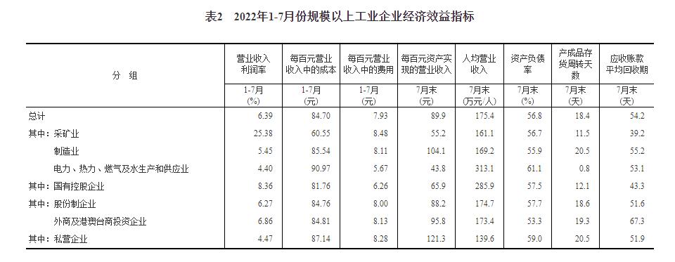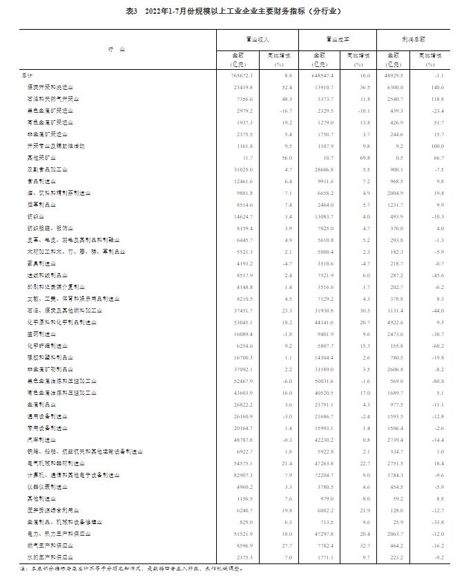 | 1—7月份,全国规模以上工业企业实现利润总额48929.5亿元,同比下降1.1%(按可比口径计算,详见附注二)。 1—7月份,规模以上工业企业中,国有控股企业实现利润总额17370.6亿元,同比增长8.0%;股份制企业实现利润总额36347.3亿元,增长3.2%;外商及港澳台商投资企业实现利润总额10935.3亿元,下降14.5%;私营企业实现利润总额13116.5亿元,下降7.1%。 1—7月份,采矿业实现利润总额9961.1亿元,同比增长1.05倍;制造业实现利润总额36217.2亿元,下降12.6%;电力、热力、燃气及水生产和供应业实现利润总额2751.2亿元,下降12.5%。 1—7月份,在41个工业大类行业中,16个行业利润总额同比增长,25个行业下降。主要行业利润情况如下:煤炭开采和洗选业利润总额同比增长1.41倍,石油和天然气开采业增长1.19倍,电气机械和器材制造业增长18.4%,化学原料和化学制品制造业增长9.3%,有色金属冶炼和压延加工业增长5.1%,专用设备制造业下降2.6%,农副食品加工业下降7.5%,非金属矿物制品业下降8.2%,计算机、通信和其他电子设备制造业下降9.6%,纺织业下降10.3%,电力、热力生产和供应业下降12.0%,通用设备制造业下降12.8%,汽车制造业下降14.4%,石油、煤炭及其他燃料加工业下降44.0%,黑色金属冶炼和压延加工业下降80.8%。 1—7月份,规模以上工业企业实现营业收入76.57万亿元,同比增长8.8%;发生营业成本64.85万亿元,增长10.0%;营业收入利润率为6.39%,同比下降0.63个百分点。 7月末,规模以上工业企业资产总计149.68万亿元,同比增长10.0%;负债合计85.08万亿元,增长10.5%;所有者权益合计64.60万亿元,增长9.4%;资产负债率为56.8%,同比提高0.2个百分点。 7月末,规模以上工业企业应收账款20.69万亿元,同比增长14.2%;产成品存货6.01万亿元,增长16.8%。 1—7月份,规模以上工业企业每百元营业收入中的成本为84.70元,同比增加0.95元;每百元营业收入中的费用为7.93元,同比减少0.50元。 7月末,规模以上工业企业每百元资产实现的营业收入为89.9元,同比减少1.2元;人均营业收入为175.4万元,同比增加15.5万元;产成品存货周转天数为18.4天,同比增加1.0天;应收账款平均回收期为54.2天,同比增加2.7天。 ![]() ![]() ![]() ![]() ![]() ![]() 附注 一、指标解释及相关说明 1、利润总额:指企业在生产经营过程中各种收入扣除各种耗费后的盈余,反映企业在报告期内实现的盈亏总额。 2、营业收入:指企业从事销售商品、提供劳务和让渡资产使用权等生产经营活动形成的经济利益流入。包括主营业务收入和其他业务收入。 3、营业成本:指企业从事销售商品、提供劳务和让渡资产使用权等生产经营活动发生的实际成本。包括主营业务成本和其他业务成本。营业成本应当与营业收入进行配比。 4、资产总计:指企业过去的交易或者事项形成的、由企业拥有或者控制的、预期会给企业带来经济利益的资源。 5、负债合计:指企业过去的交易或者事项形成的、预期会导致经济利益流出企业的现时义务。 6、所有者权益合计:指企业资产扣除负债后由所有者享有的剩余权益。 7、应收账款:指资产负债表日以摊余成本计量的,企业因销售商品、提供服务等经营活动应收取的款项。 8、产成品存货:指企业报告期末已经加工生产并完成全部生产过程、可以对外销售的制成产品。 9、营业收入利润率=利润总额÷营业收入×100%,单位:%。 10、每百元营业收入中的成本=营业成本÷营业收入×100,单位:元。 11、每百元营业收入中的费用=(销售费用+管理费用+研发费用+财务费用)÷营业收入×100,单位:元。 12、每百元资产实现的营业收入=营业收入÷平均资产÷累计月数×12×100,单位:元。 13、人均营业收入=营业收入÷平均用工人数÷累计月数×12,单位:万元/人。 14、资产负债率=负债合计÷资产总计×100%,单位:%。 15、产成品存货周转天数=360×平均产成品存货÷营业成本×累计月数÷12,单位:天。 16、应收账款平均回收期=360×平均应收账款÷营业收入×累计月数÷12,单位:天。 17、在各表的利润总额同比增长栏中,标“注”的表示上年同期利润总额为负数,即亏损;数值为正数的表明利润同比增长;数值在0至-100%之间(不含0)的表明利润同比下降;下降幅度超过100%的表明由上年同期盈利转为本期亏损;数值为0的表明利润同比持平。 18、在主要分组中,国有控股企业包括国有绝对控股企业和国有相对控股(含协议控股)企业等。外商及港澳台商投资企业包括中外(或与港澳台资)合资经营企业、合作经营企业及外资(或港澳台资)的股东占公司注册资本比例达25%以上的股份有限公司等。私营企业包括私营有限责任公司、私营股份有限公司、私营合伙企业和私营独资企业等。 二、规模以上工业企业利润总额、营业收入等指标的增速均按可比口径计算。报告期数据与上年所公布的同指标数据之间有不可比因素,不能直接相比计算增速。其主要原因是:(一)根据统计制度,每年定期对规模以上工业企业调查范围进行调整。每年有部分企业达到规模标准纳入调查范围,也有部分企业因规模变小而退出调查范围,还有新建投产企业、破产、注(吊)销企业等变化。(二)加强统计执法,对统计执法检查中发现的不符合规模以上工业统计要求的企业进行了清理,对相关基数依规进行了修正。(三)加强数据质量管理,剔除跨地区、跨行业重复统计数据。 三、统计范围 规模以上工业企业,即年主营业务收入为2000万元及以上的工业