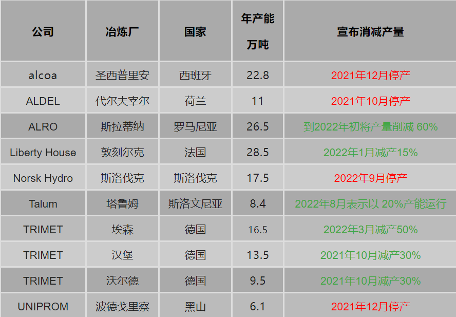 | 沪铝主力合约AL2210上周收盘价上涨3.1%至18820元/吨。 ![]() 数据来源:Choice 截止2022年8月26日全国氧化铝四地均价为2952元/吨,较前一周下跌6元/吨。据Mysteel统计,8月25日中国氧化铝港口库存合计30.5万吨,较上周减少3.4万吨。 受益于铝价回升,冶炼厂利润增加至1000元/吨左右。 ![]() 数据来源:Choice 据Mysteel统计,四川省6月底电解铝运行产能100万吨,受用电紧张影响,自7月中旬开始释放压减负荷、让电于民的信号,自主错避峰。进入8月之后,电力供应形势更加严峻,铝厂减产规模扩大,截止8月22日,四川省电解铝产能已全部完成停产。此外,重庆市电力供应同样趋紧,目前影响两家电解铝厂,涉及产能3万吨左右。河南省同样存在负荷缺口,目前影响电解铝产能4万吨左右,其他企业存在压负荷情况。 据上海有色网了解,海德鲁发布消息, Hydro Sundals铝厂的罢工将立即取消,8月25日起恢复正常运营,并恢复向客户供应产品。 据上海金属网了解,德国铝生产商斯佩拉(Speira)在考虑将其德国冶炼厂的产量削减至总产能的50%,以应对能源成本飙升。Speira位于诺伊斯的铝冶炼厂可以生产约16万吨铝,尽管目前只生产约14万吨。Speira主管莫里茨·汉森表示该公司将在9月就额外的减产作出决定。 据Mysteel了解,因Industri Energi和Norsk Industri未能在商定截止日期前达成集体协议,8月22日海德鲁旗下挪威Sunndal铝厂和美铝旗下Mosjen铝厂开始罢工。此次罢工将导致Sunndal铝厂在前四周内逐步减产20%,如罢工持续时间超过四周,每周将再减产10%,直到最后保留一个工区运行。Mosjen铝厂将在罢工期间停止产品交付,在9月19日前减产20%,如罢工持续时间超过9月19日,将每隔一周再减产10%,直到404个电解槽中保留34个电解槽运行。 天下铝讯统计了2021年以来欧洲铝厂减停产情况: ![]() 数据来源:天下铝讯 截止2022年8月26日当周沪伦比值平均为7.74,上周为7.65; 当周进口平均亏损1273元/吨,进口窗口关闭。 ![]() 数据来源:Choice 据海关总署数据显示,2022年7月未锻轧铝及铝材出口数量为65万吨,同比+39%,环比+7%;未锻轧铝及铝材进口数量为19万吨,同比-38%,环比+3%。2022年7月我国铝线缆出口量为22348.5吨,环比增长15%,同比增长112.2%。 ![]() 数据来源:海关总署 本周国内铝下游加工龙头企业开工率环比上周继续下滑0.3个百分点至65.4%。分板块看,原生铝合金龙头企业开工率仍在60%;铝板带龙头企业开工率-0.6个百分点至79%;国内铝线缆龙头企业+1个百分点至59%;铝型材龙头企业开工率环比上周-1.5%,达65.2%;本周铝箔龙头企业开工率-0.8个百分点至81.3%;再生铝龙头企业开工率持稳于47.9%。 截止2022年8月26日电解铝社会库存(含仓单)为67.9万吨,较上周四减少1000吨; LME铝库存27.8万吨,较上周增加4250吨,注销仓单占比为34%。 ![]() 数据来源:SMM、Choice ![]() 数据来源:Choice 宏观面,国内稳增长政策继续释放为国内经济复苏提供活力。美联储主席鲍威尔在杰克逊霍尔年会上的发言偏鹰,预计9月仍将加息75BP。 基本面,国内高温限电以及欧洲能源短缺导致多家铝冶炼厂减停产,但随着国内气候好转,冶炼厂生产将逐步恢复。此外国内中端加工材开工率依然呈环比下降局势,库存去化幅度较小。 (文章来源:东方财富研究中心) (责任编辑:admin) |
