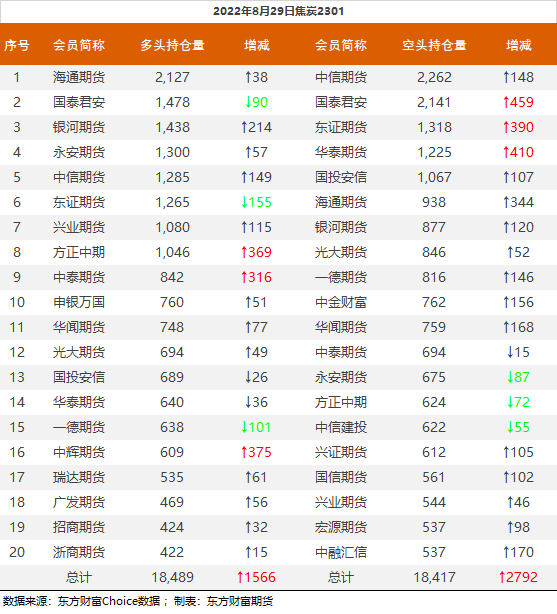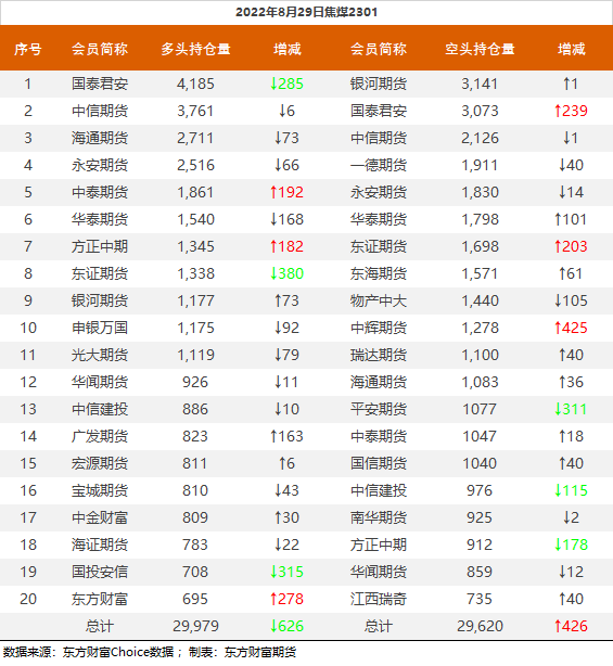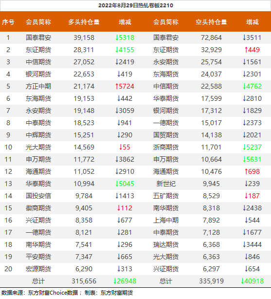 | 截至8月29日收盘,螺纹钢2210收3965/吨,跌2.77%;热卷2210收3961元/吨,跌2.05%;铁矿石2301收714元/吨,跌1.38%;焦炭2301收2561元/吨,跌3.59%;焦煤2301收1963.5元/吨,跌2.17%。 螺纹钢2210合约前20席位多单减仓81565手至54.1万余手,空单减仓54470手至58.8万余手,整体净空46405手。其中国泰君安期货多单减持29101手,空单减持744手,整体净空42527手。 各品种具体如下: ![]() 各品种持仓情况具体如下: ![]() ![]() ![]() ![]() ![]() (文章来源:东方财富研究中心) (责任编辑:admin) |