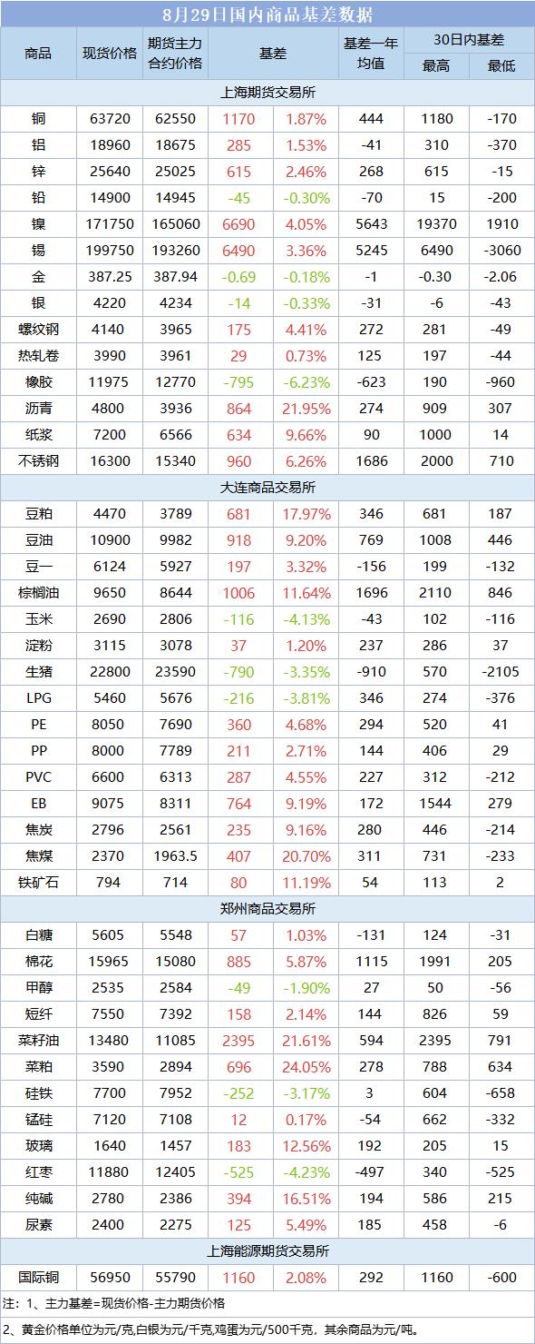 基差报告:8月29日国内商品基差数据一览