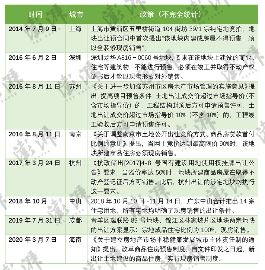 | 合肥2022年第三批次一宗地块试点现房销售;福建福州出现第一个“现房销售”地块……近日,多地将“现房销售”写入土地出让文件中。 据中指研究院监测,2021年以来,北京、杭州、福州、合肥、西安、宁波等地在土拍环节试点现房销售。仅今年以来,据澎湃新闻不完全统计,包括合肥、北京、福州永泰县、济南等地的多宗地块提及“现房销售”。 以合肥为例,8月24日,合肥市发布第三批集中供地公告,共推出28宗涉宅用地,总土地出让面积3282亩,总起始价277.4亿元,并将于9月23日正式出让。值得一提的是,该批次地块中首次推出现房销售地块。其中,蜀山区SS202210号地块明确提出“按精装现房销售实施”。 据合肥在线,尽管此前的土地拍卖公告中多宗地块对开发商建设进度提出要求,达到一定比例才能开售,但是明确提出必须按现房销售,在合肥尚属首次。 另以北京为例,北京于2021年第二轮集中土拍时首次试点竞现房销售面积地块——大兴黄村海户新村地块。据《北京日报》,该地块共吸引3家企业竞买,经过17轮价格竞拍达到土地合理上限价格37.84亿元,又经过23轮竞“现房销售面积”后成交,竞报“现房销售面积”5.4万平方米,最终该项目中将有近一半的商品房实行“现房销售”。 今年,北京最新公布的第三批次供地18宗地块中有13宗项目设置了竞现房销售面积环节。而在北京今年首批集中供地中,18宗地块中有9宗地块涉及竞报现房销售面积程序;今年第二批集中供地中17宗地块中有12宗涉及“竞现房销售”。 此外,福州永泰县自然资源和规划局在7月15日的一则公告显示,葛岭镇溪西村一地块在出让要求中提到:地块按现房销售实施,规划房屋竣工验收之后,竞得人方可申请房屋销售手续。 诸葛找房数据研究中心高级分析师陈霄认为,在这个时间节点提出现房销售多少受到近期烂尾楼风波的影响,出于保交楼的立场而提出的,多地出现的烂尾楼停贷风波事件导致购房者对商品房预售制度产生一定的抵触心态,取消预售制度的言论一时之间议论纷纷。 中指研究院指数事业部市场研究总监陈文静也认为,今年7月以来,部分城市的项目出现“停工”现象,对购房者置业情绪和预期均带来不利影响,而现房销售既能够保护消费者的权益不受侵害,也能对楼盘质量和交付行为进行约束,有利于“保交楼、稳民生”。 已有多地探索现房销售 对于现房销售试点的探索,最早或可追溯至2014年。 据新华网报道,2014年7月9日,上海市黄浦区五里桥街道104街坊39/1宗纯宅地竞拍,最终丽丰控股旗下东方动力有限公司以5.77亿元的价格竞得,溢价62.54%,成交楼板价59859元,剔除保障房后楼板价达85810元/平。地块在出让预合同中首次提出了“该地块内建成房屋不得预售,须以全装修现房销售”。 到了2016年,为抑制房企拿地热情,深圳也推出首宗现房销售试点地块——龙华A816-0060号地块,要求在该地块上建设的商业、住宅等建筑物,不能进行预售,必须在竣工并取得不动产权证书后才能以现售形式对外销售。 同年,杭州、南京等地在土地拍卖时,均提出现房销售要求。 据不完全统计,2016年至2020年间,房地产市场活跃度较高,深圳、苏州、南京、杭州、中山、成都、海南等城市在土地端设置现房销售条件,抑制土地市场热度。 ![]() 以苏州为例,2016年8月11日,苏州市发布《关于进一步加强苏州市区房地产市场管理的实施意见》,共13条。其中规定,提高项目预售条件:土地出让成交价超过市场指导价(不含市场指导价)的,工程结构封顶后方可申请预售许可;土地出让成交价超过市场指导价10%(不含10%)的,工程竣工验收后方可申请预售许可。 这一政策被业内解读为,一旦拍地价格过高,触碰价格红线,就需要以结构封顶或竣工验收为标准,来办理预售许可证。通俗说就是“地价较高的项目必须以现房的形式进行销售”。 2016年8月11日,南京市人民政府网站公布《关于调整南京市土地公开出让竞价方式、商品房贷款首付比例的意见》,按照政策,当网上竞价达到最高限价90%时,该地块所建商品住房必须现房销售。 2020年3月7日,海南省委办公厅、省政府办公厅印发《关于建立房地产市场平稳健康发展城市主体责任制的通知》,《通知》提出改革商品住房预售制度,自文件印发之日起,新出让土地建设的商品住房,实行现房销售制度。 这也让海南成为全国首个省级出台现房销售政策的省份。 对于实行现售制度的背景,时任海南省住建厅厅长霍巨燃在当日举行的新闻发布会上表示,因商品住房实行预售制度引发的质量投诉、合同纠纷、延期交房、配套设施不落实、违规销售甚至开发商收钱跑路等一系列问题,成为房地产投诉和纠纷的最主要因素。为从根本上杜绝因预售制度带来的系列问题,《通知》提出改革商品住房预售制度。 现房销售试点效果如何? 不过,从上述提及现房销售试点的城市来看,有部分城市目前已偃旗息鼓,包括杭州、南京等城市在推行一段时间后,改变了土地出让规则。 以杭州为例,2017年3月24日,杭州市国土资源局发布土地新政,当溢价率达到50%时地块所建商品房屋须在取得不动产登记证后方可销售。但是仅4个月后,杭州推出的土地出让就改变规则——“溢价50%须现房销售”的条款删除。 彼时,据《钱江晚报》2017年7月12日报道,2017年3月24日后的杭州土地出让,主城区共出让10宗涉宅地块,其中有9宗必须现