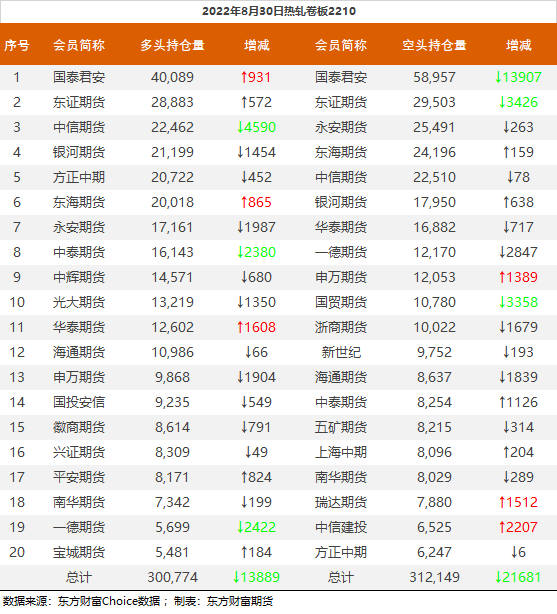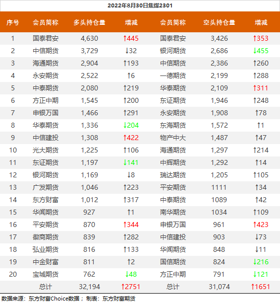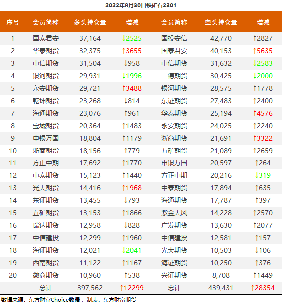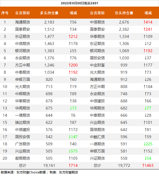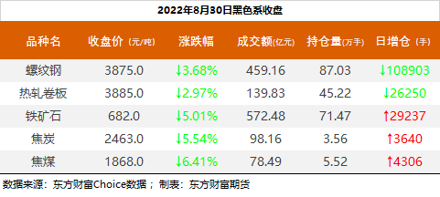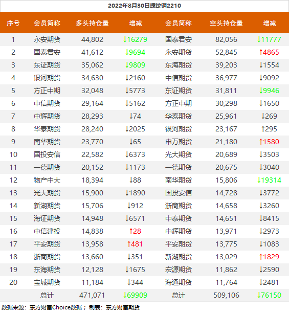 | 截至8月30日收盘,螺纹钢2210收3875/吨,跌3.68%;热卷2210收3885元/吨,跌2.97%;铁矿石2301收682元/吨,跌5.01%;焦炭2301收2463元/吨,跌5.54%;焦煤2301收1868元/吨,跌6.41%。 螺纹钢2210合约前20席位多单减仓69909手至47.1万余手,空单减仓76150手至50.9万余手,整体净空38035手。其中永安期货多单减持16279手,空单增持4865手,整体净空8043手。 各品种具体如下: ![]() 各品种持仓情况具体如下: ![]() ![]() ![]() ![]() ![]() (文章来源:东方财富研究中心) (责任编辑:admin) |