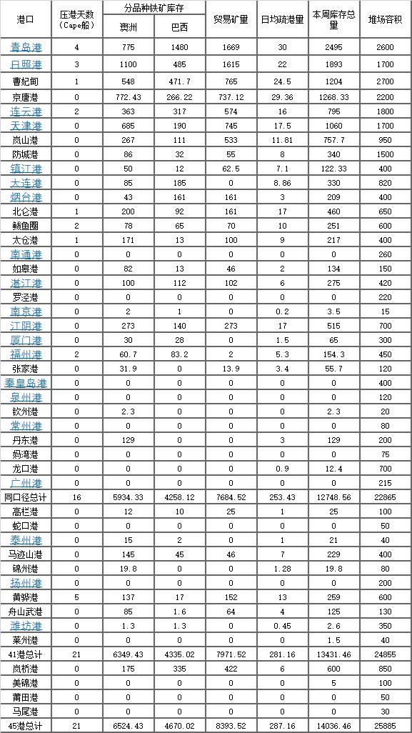 数据:进口铁矿石港口库存调查统计