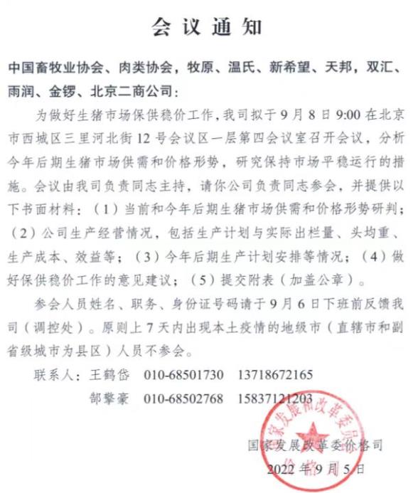 | 财联社记者从多位业内人士处了解到,国家发改委发布通知,为做好生猪市场保供稳价工作,拟于9月8日(本周四)开展研讨会,邀请中国畜牧业协会、肉类协会、牧原、温氏、新希望、天邦、双汇、雨润、金锣、北京二商公司等单位、公司参与会议。相关人士透露,本次会议将分析当前和今年后期生猪市场供需和价格形势,以及上述公司生产经营、今年后期生产计划安排等情况。
