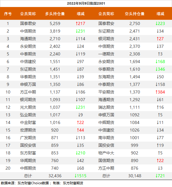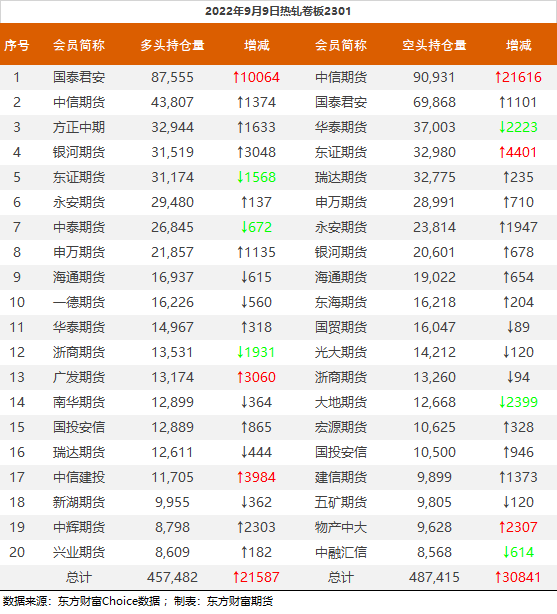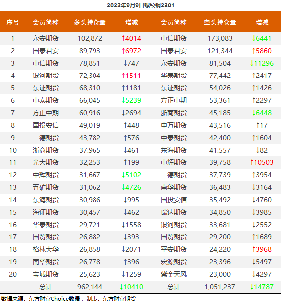 | 截至9月9日收盘,螺纹钢2301收3791元/吨,涨2.05%;热卷2301收3838元/吨,涨1.16%;铁矿石2301收720.5元/吨,涨3.74%;焦炭2301收2548.5元/吨,涨2.33%;焦煤2301收1903元/吨,涨2.56%。 螺纹钢2301合约前20席位多单减仓10410手至96.2万余手,空单减仓14787手至105.1万余手,整体净空89093手。其中永安期货多单增持4014手,空单减持11296手,整体净多21368手。 各品种具体如下: ![]() 各品种持仓情况具体如下: ![]() ![]() ![]() ![]() ![]() (文章来源:东方财富研究中心) (责任编辑:admin) |