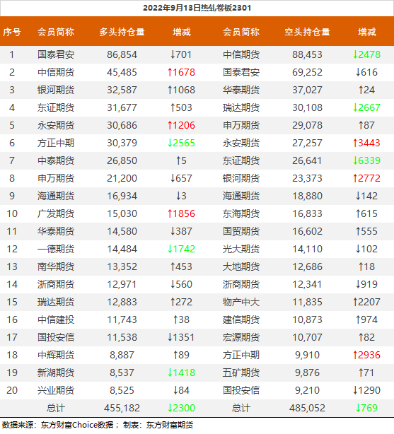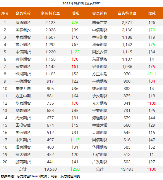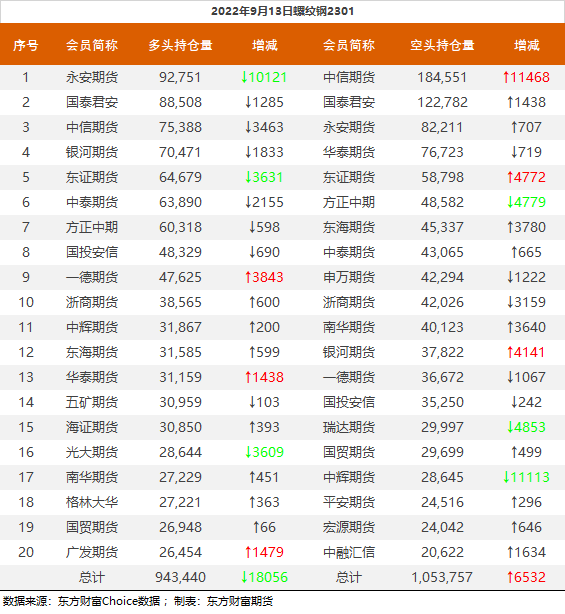 | 截至9月13日收盘,螺纹钢2301收3794元/吨,涨1.01%;热卷2301收3864元/吨,涨1.18%;铁矿石2301收728.5元/吨,涨1.96%;焦炭2301收2603元/吨,涨3.33%;焦煤2301收1968.5元/吨,涨4.96%。 螺纹钢2301合约前20席位多单减仓18056手至94.3万余手,空单增仓6532手至105.3万余手,整体净空110317手。其中中信期货多单减持3463手,空单增持11468手,整体净空109163手。 各品种具体如下: ![]() 各品种持仓情况具体如下: ![]() ![]() ![]() ![]() ![]() (文章来源:东方财富研究中心) (责任编辑:admin) |
