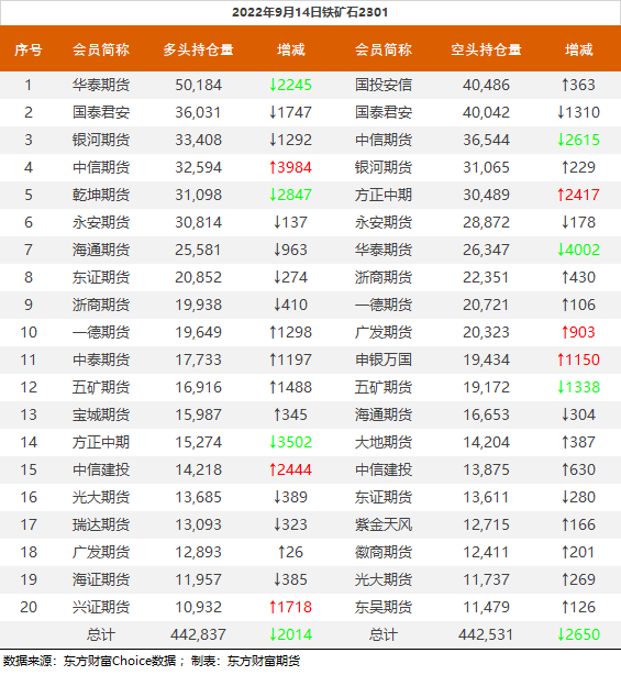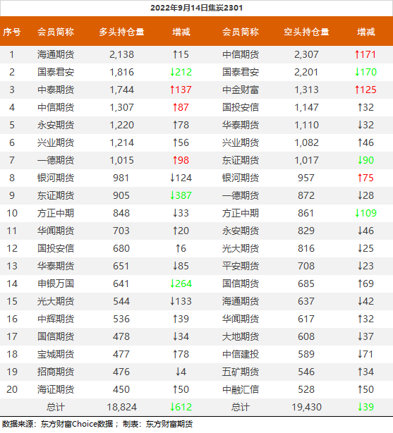 | 截至9月14日收盘,螺纹钢2301收3741元/吨,跌1.29%;热卷2301收3800元/吨,跌1.55%;铁矿石2301收720.5元/吨,跌0.69%;焦炭2301收2581/吨,跌0.14%;焦煤2301收1955.5元/吨,涨0.57%。 螺纹钢2301合约前20席位多单增仓41907手至97.8万余手,空单增仓24606手至107.3万余手,整体净空95692手。其中中信期货多单增持9429手,空单减持8718手,整体净空91016手。 各品种具体如下: ![]() 各品种持仓情况具体如下: ![]() ![]() ![]() ![]() ![]() (文章来源:东方财富研究中心) (责任编辑:admin) |