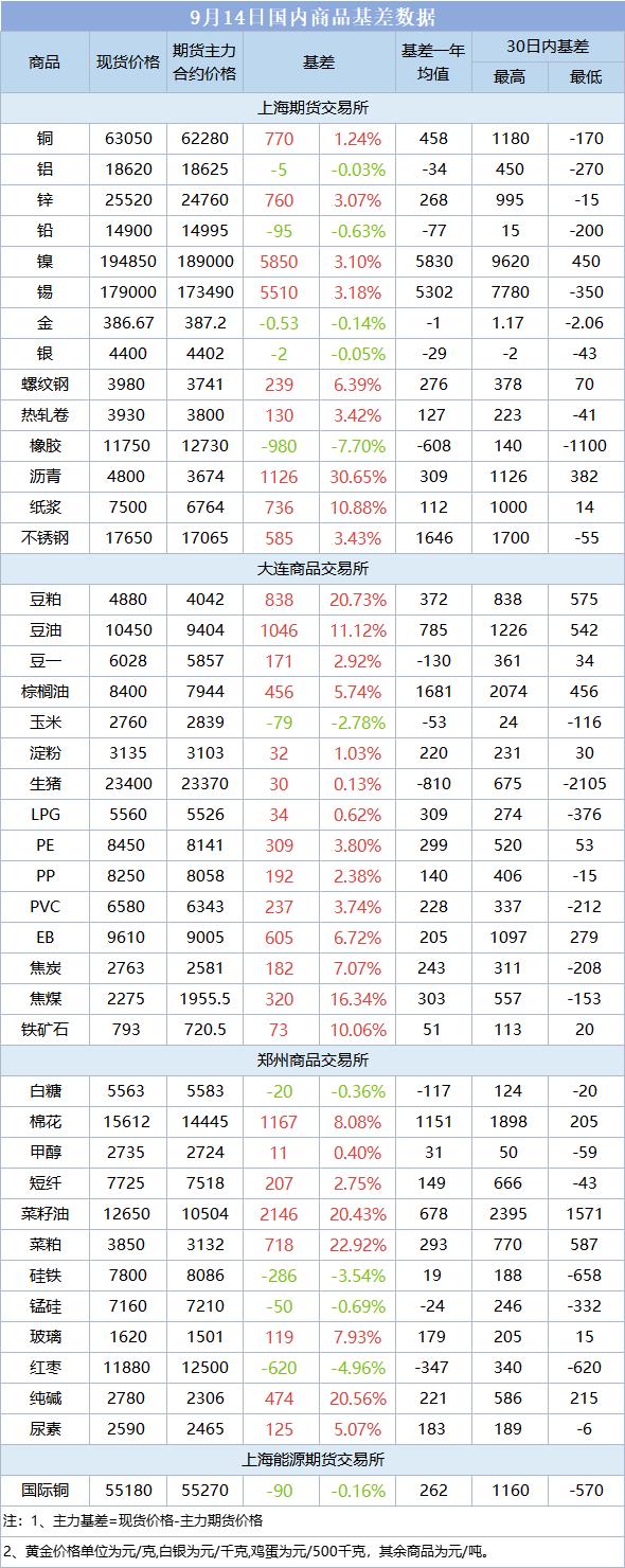 基差报告:9月14日国内商品基差数据一览