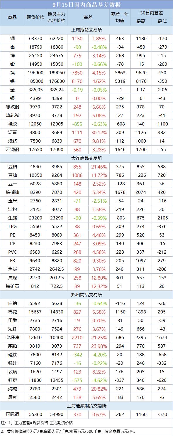 基差报告:9月15日国内商品基差数据一览