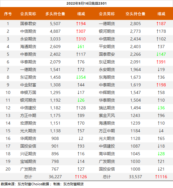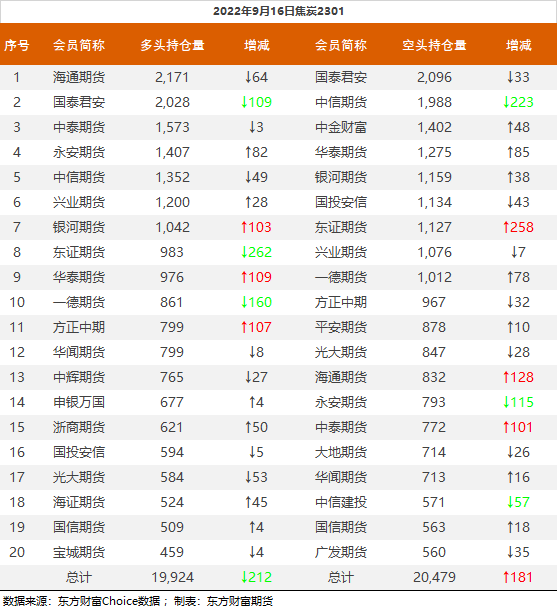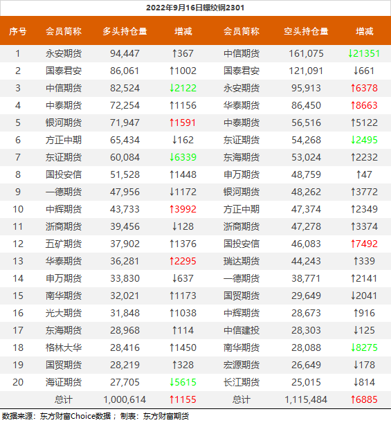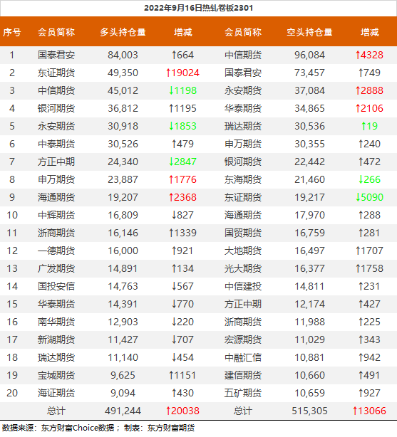 | 截至9月13日收盘,螺纹钢2301收3686元/吨,跌1.63%;热卷2301收3758元/吨,跌1.34%;铁矿石2301收715元/吨,跌1.24%;焦炭2301收2622元/吨,涨0.1%;焦煤2301收2013元/吨,涨0.57%。 螺纹钢2301合约前20席位多单增仓1155手至100万余手,空单增仓6885手至111.5万余手,整体净空114870手。其中中信期货多单减持2122手,空单减持21351手,整体净空78551手。 各品种具体如下: ![]() 各品种持仓情况具体如下: ![]() ![]() ![]() ![]() ![]() (文章来源:东方财富研究中心) (责任编辑:admin) |