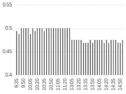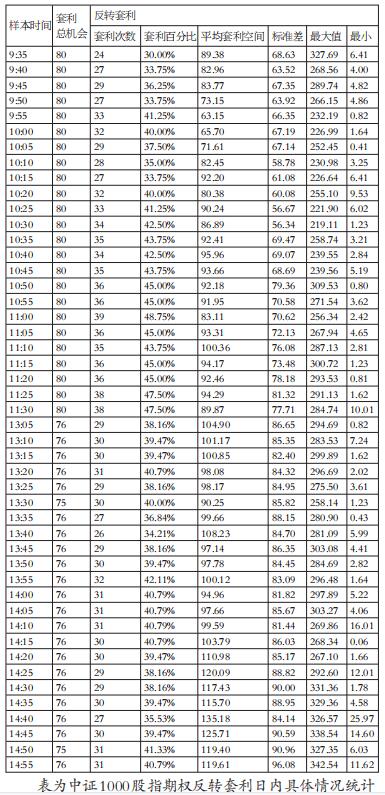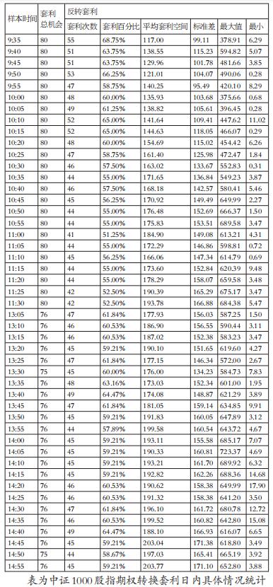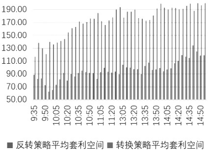根据反转策略和转换策略的套利机会汇总发现,两种套利机会并没有呈现出在开盘和收盘时间段集中的现象,并且每一阶段的机会概率在0.5上下波动,其中上午时段(9:45—11:30)的套利机会相对较多。具体来看,反转策略的套利空间呈现上午时段低于下午时段,并且套利利润主要集中在下午时段,但转换策略的套利空间在开盘后就呈现逐步上升状态,并且上午时段略微低于下午时段。