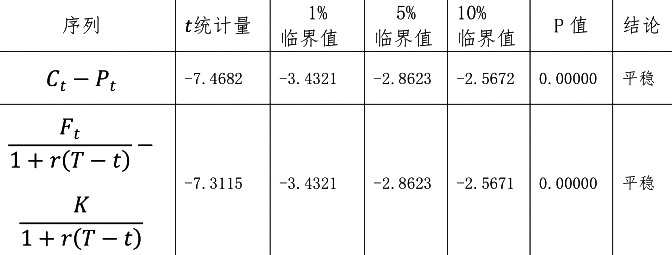 图为中证1000股指期权及期货走势(单位:元/点) 本文调用Python软件统计包,利用时间序列的ADF单位根检验,分别对Ct-Pt序列和<D:\kt2022\221226c5.tif>进行检验,结果如下表所示: