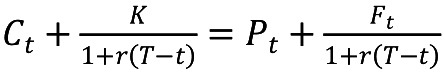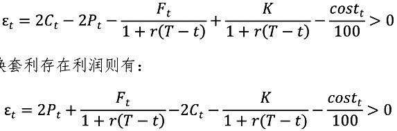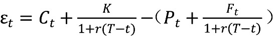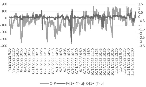 其中,当前时间为t,T为到期日,C为看涨期权的价格,K是期权的执行价格,r为无风险利率,F为股指期货的价格,P为看跌期权的价格,(1)为期权执行价格无风险贴现值,(1)为股指期货无风险贴现值。 根据市场有效性假设和交割原理,在交割时间点看涨期权和看跌期权不存在套利空间,即看涨期权相对于看跌期权不存在高估现象,反之也成立。因此,定义(2),当(2)≠0且不考虑交易费用时,意味着期权市场可实现无风险套利。 对方程式(1)进行移项,可以得到方程式(2):