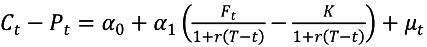 统计检验 考虑到中证1000股指期权的市场流动性正在逐步发展,分析我国中证1000股指期权在上市初期的有效性,需检验股指期权市场价格是否满足期权平价关系再进行检验,即假设股指期权和股指期货存在如下回归特性: