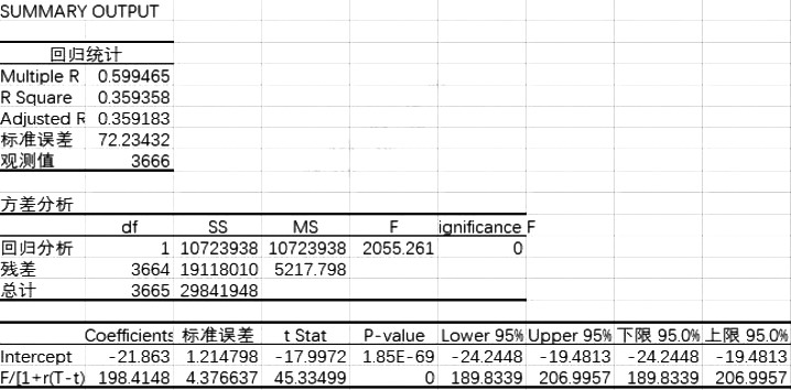 表为平稳性检验结果 从上表可以看出,在1%的显著性水平上,中证1000股指期权与中证1000股指期货的价格序列统计量均小于其临界值,因而拒绝原数据序列的单位根假设,也就是Ct-Pt序列和<D:\kt2022\221226c5.tif>序列均为零阶单整的,可以认为这两个时间序列是平稳的,可用来对中证1000股指期权平价关系进行回归模型的检验。 利用普通最小二乘法(OLS)对回归模型进行零值检测,检验结果如下表所示。回归结果显示R2的值为0.359358,这表明拟合效果不佳, 显著不等于0, 显著不等于1,意味着中证1000股指期权和中证1000股指期货之间不存在长期的线性关系。由此说明,在中证1000股指期权上市初期,存在可以通过期权平价公式获得无风险套利机会。
