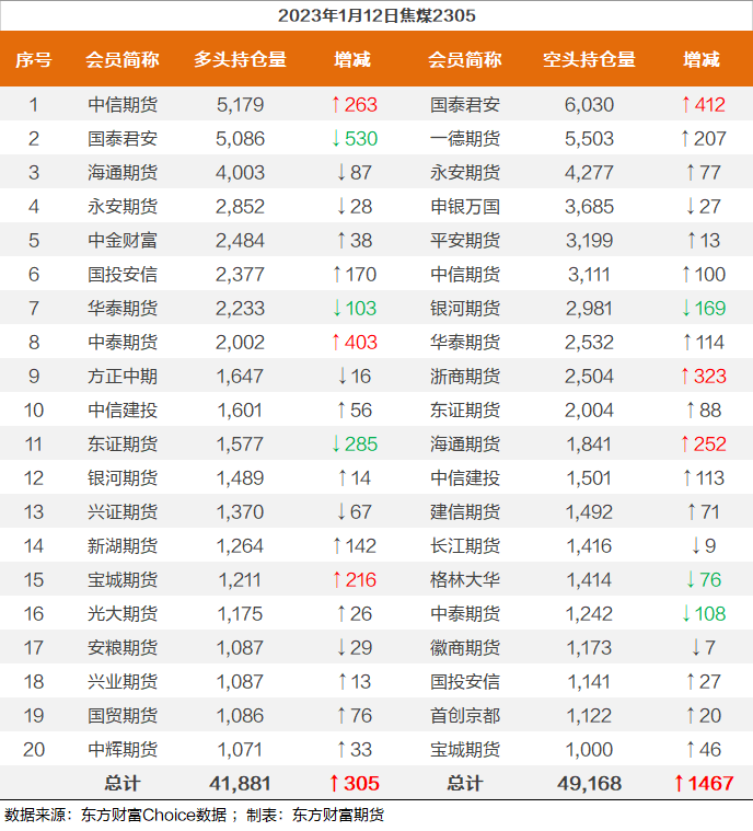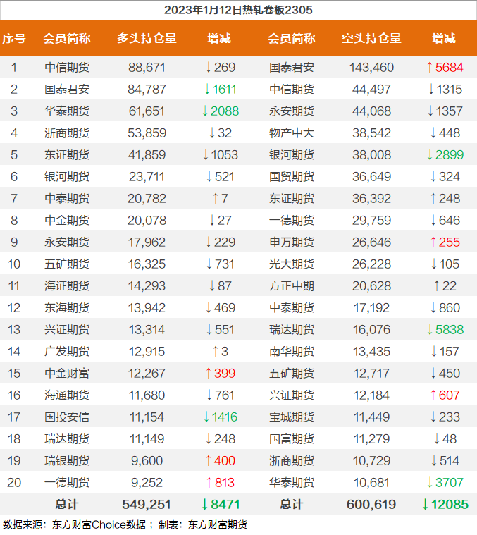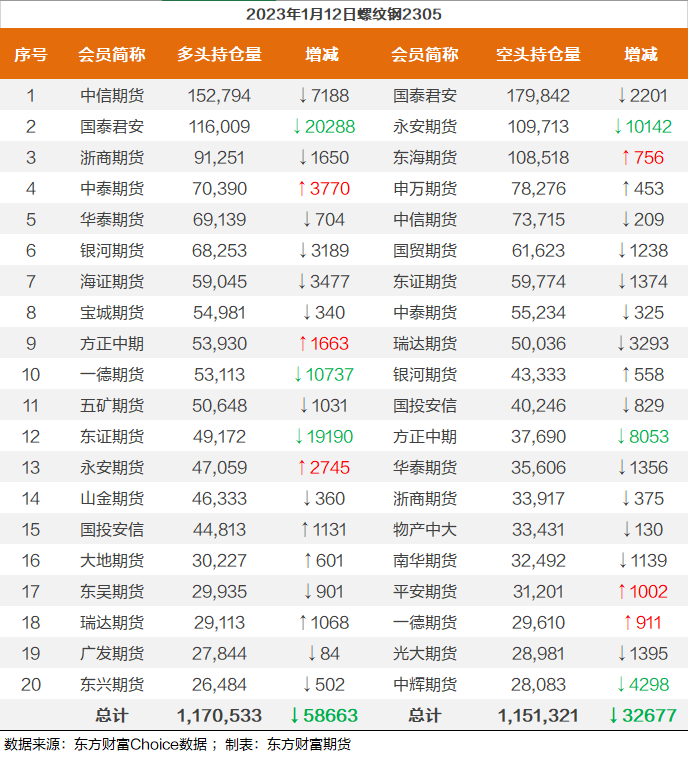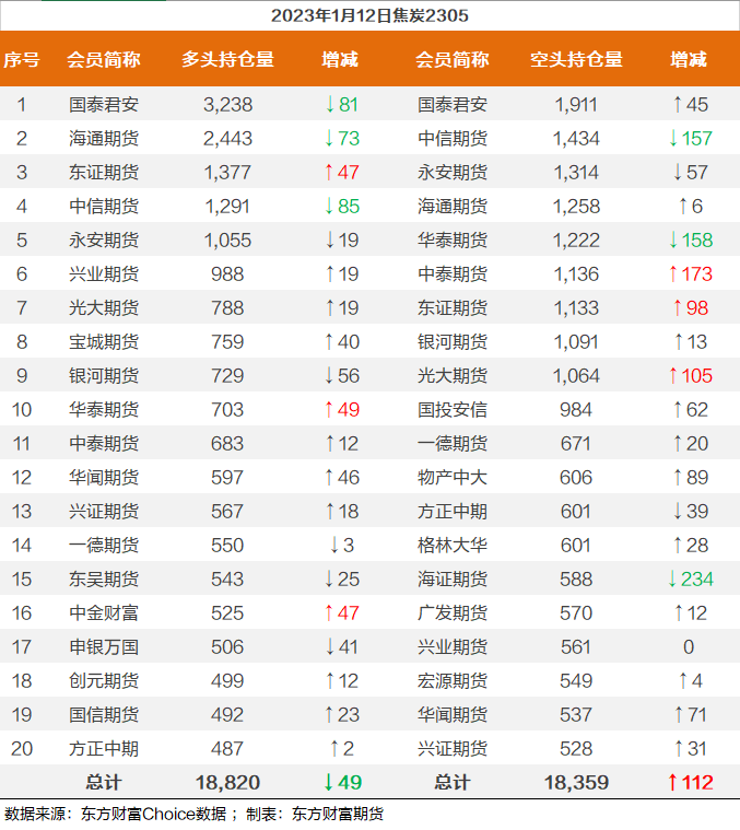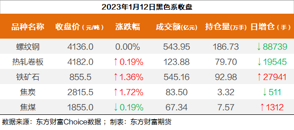 | 截至1月12日收盘,螺纹钢2305收4136/吨,持平;热卷2305收4182元/吨,涨0.19%;铁矿石2305收855.5元/吨,涨1.36%;焦炭2305收2815.5/吨,涨1.72%;焦煤2305收1855元/吨,跌0.19%。 螺纹钢2305合约前20席位多单减仓58663手至117万余手,空单减仓32677手至115.1万余手,整体呈净多19212手。其中,国泰君安期货多单减持20288手,空单减持2201手,整体呈净空63833手。 各品种具体如下: ![]() 各品种持仓情况具体如下: