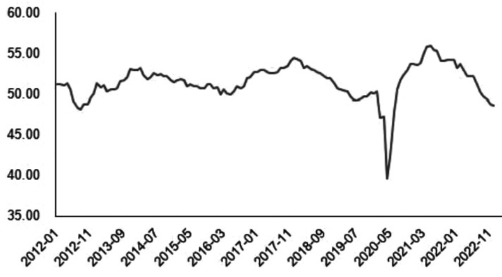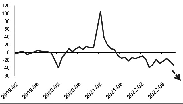 图为商品房销售面积当月同比变化 [海外需求存在不确定性] 2022年在美联储持续加息的影响下,全球需求集体走弱,摩根大通全球制造业PMI自2022年年初以来持续下滑,至12月已经降至荣枯线以下,录得48.6%,近10年来仅次于2020年疫情防控期间的历史低位。外需走弱对我国出口的影响已经显现,国内对外出口自2022年8月开始收缩,并于10月跌至负值,外需由经济拉动项转变为经济拖累项。 2023年海外需求和我国出口存在两方面的不确定性:一是美联储加息节奏仍存不确定性。在2022年12月美联储议息会议纪要中,委员们较上次会议进一步上调了本轮加息的终点利率预测值,且表示不会在2023年降息,当前市场对于外需触底修复的预期显得稍微积极。二是美联储加息至顶后全球需求修复存在不确定性。目前需求回落的压力正由欧美发达地区进一步蔓延到外围经济体,体现在我国对东盟出口自2022年四季度开始回落。即便后期欧美紧缩政策转向,其他经济体需求的改善也有时滞。
