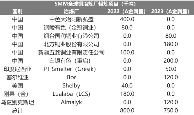 图为全球铜矿产量变化 国内方面,受益于驱龙铜矿放量,国内铜精矿产量大幅增加。2022年1—10月,我国铜精矿产量累计为161.77万金属吨,累计同比增加9.16%。进口矿方面,亦增量明显,2022年1—10月,我国铜精矿累计进口量为2076万吨,累计同比增加8.4%。整体来看,我国铜精矿供应保持宽松状态,加工费亦逐步走高,不过自给率偏低,在20%左右。 2023年全球铜矿仍有新扩建及新投产产能释放,预计增量约84万金属吨,整体来看铜矿供应将继续保持宽松状态。 废铜、粗铜供应偏紧 受国内疫情以及国家财政部、国家税务总局联合发布的《关于完善资源综合利用增值税政策的公告》影响,国内废铜回收拆解不畅,叠加利废需求增加,导致废铜供应趋紧。2022年1—11月,我国废铜产量累计为83万吨,同比减少20.5%。进口方面,2022年1—10月,我国废铜进口量累计为147万吨,累计同比增加7.61%。 而废铜供应偏紧,亦影响废铜产粗铜的产量,叠加2022年新建精炼产能主要以阳极铜为原料,致国内粗铜供应紧张,国产及进口粗铜加工费一路下行。进口方面,2022年1—10月,我国进口阳极铜累计为99万吨,累计同比增加29.34%。 近两年我国粗炼新增产能项目相对有限,在远期规划较多,而海外粗炼产能预计将于2024年后集中释放,2023年仍需留意废铜、粗铜等冷料对精炼产能的影响。