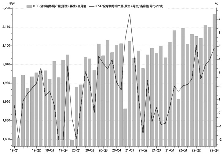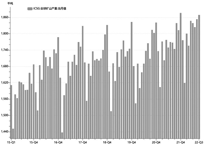 图为全球铜冶炼厂粗炼项目 精炼铜产能保持增势 2022年,全球精炼铜产能保持增势,但节奏较慢。据国际铜研究小组(ICSG)数据,2022年1—10月,全球精炼铜产量累计为2126万吨,累计同比增长3.05%。