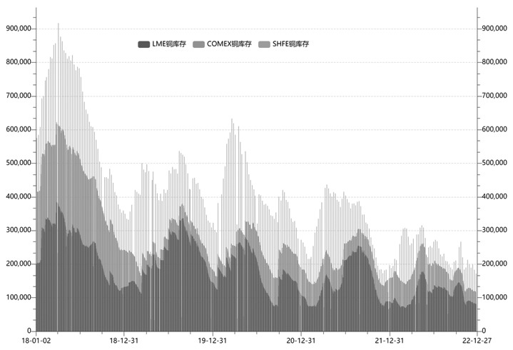 图为全球精炼铜产量 国内市场,年内铜冶炼厂利润虽处于高位,但受疫情、高温限电以及冷料紧张等影响,国内精铜产量不及预期。2022年1—11月,我国精炼铜产量累计为941.21万吨,累计同比增加3.36%。 进口方面,2022年1—10月,我国累计进口精炼铜314万吨,累计同比增加9.65%。 2023年,预计在全球铜矿供应偏宽松、冶炼厂利润可观背景下,全球精炼铜产量继续增加,国内约有56万吨增量,而海外增量较少,不过2024—2025年海外冶炼产能有望明显提速。 2022年,国内外铜库存持续去化,全球铜显性库存降至历史偏低水平,截至12月23日LME铜库存为81475吨,COMEX铜库存为35494吨,国内上期所铜库存为54569吨。