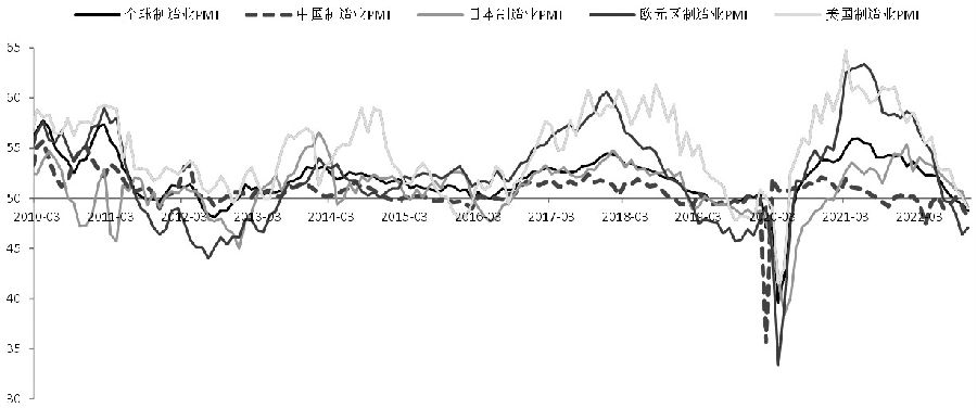 图为CEIC先行指标与NBER衰退周期 C需求端预期强于现实 在经济下滑、衰退预期下海外需求面临下降风险,全球主要经济体制造业景气度均出现不同程度回落。中国物流与采购联合会数据显示,2022年12月份全球制造业PMI为48.6%,较上月下降0.1个百分点,连续7个月环比下降,连续3个月低于50%。全年来看,受二季度疫情影响,国内制造业数据出现阶段性下滑,不过在国内持续稳经济增长的举措之下,见底回升,但终端消费分化显著。全球制造业的趋弱态势,从需求端给予铜价压力。