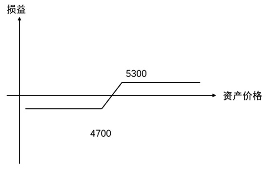 图为看涨期权牛市价差组合损益 2.看跌期权牛市价差组合 同样可以买入沪银2302合约行权价为4700的看跌期权(AG2302P4700),同时卖出沪银2302合约行权价为5300的看跌期权(AG2302P5300),构建一个由看跌期权构成的牛市价差组合。这个组合因为卖出权利金较高,因此期初就有权利金收益,但是到期后收益低于买入看涨期权构成的牛市价差策略。