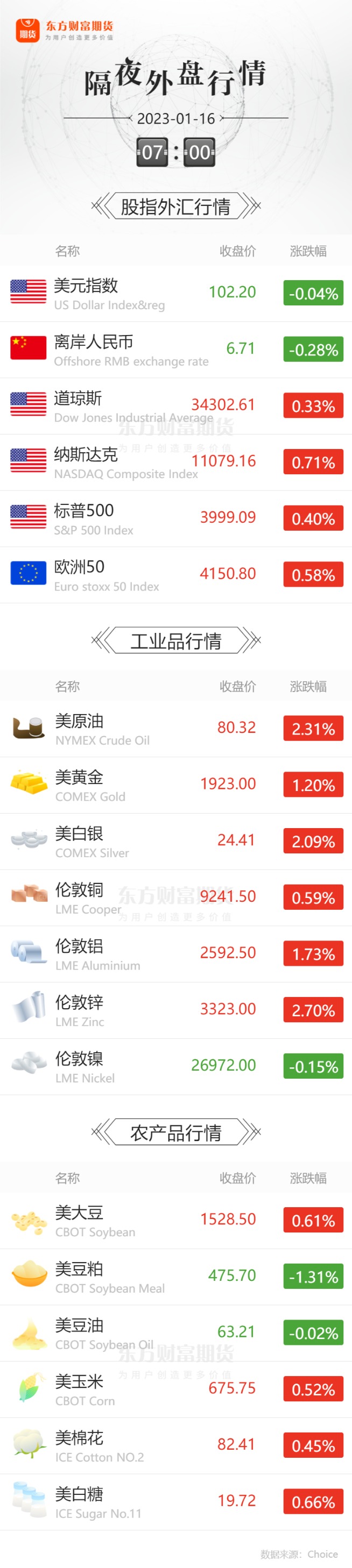 外盘收报![]() 每日精选1、重磅!央行回应七大热点 事关货币政策、房贷、平台企业、数字人民币 2、国家发改委约谈有关铁矿石资讯企业:不得哄抬价格! 3、工信部:强化大宗商品期现货市场监管 坚决遏制过度投机炒作 4、2022年钢材平均价格指数下降13.55% 专家:钢铁市场“至暗时刻”已过 宏观产经银保监会:1月13日,银保监会以视频形式召开2023年工作会议。会议深入学习贯彻党的二十大精神和中央经济工作会议精神,回顾总结工作,分析当前形势,部署2023年重点任务。银保监会党委书记、主席郭树清出席会议并讲话。银保监会党委委员、副主席曹宇主持会议,其他党委委员出席会议。会议要求,努力促进金融与房地产正常循环。坚持“房住不炒”定位,落实“金融十六条”措施,“因城施策”实施差别化信贷政策,推动房地产业向新发展模式平稳过渡。 第一财经:央行副行长宣昌能表示,稳健货币政策将在更好统筹扩大内需和供给侧结构性改革的结合点上发力。一方面,着力支持扩大国内需求。另一方面,发挥好结构性货币政策工具引导作用。当前,随着疫情防控措施优化和经济循环恢复,微观主体的信心将逐渐恢复,活力逐渐释放,我们将继续采取措施提振市场信心,激发微观主体活力。 第一财经:央行货币政策司司长邹澜表示,房地产业的良性循环对经济健康发展具有十分重要的意义,针对房地产市场出现的一些调整,人民银行会同有关部门按照党中央、国务院部署从供需两端发力,促进房地产市场平稳运行。邹澜还表示,有关部门起草了《改善优质房企资产负债表计划行动方案》。《行动方案》重点推进“资产激活”、“负债接续”、“权益补充”、“预期提升”四个方面共21项工作任务,综合施策,改善优质房企现金流,引导优质房企资产负债表回归安全区间。 大湾区之声:香港特区政府14日公布,经与广东省政府和深圳市政府沟通协调后,决定在香港与内地通关第一阶段下,就1月18日(年廿七)至21日(年三十)这4日,将现时指定陆路口岸的每日单向总人数安排,由50000人提升至65000人,以及将港珠澳大桥(珠海)的每日单向人数安排(只适用于私家车和跨境出租车司机和乘客),由1000人提升至2000人,以回应两地人士对于春节前经相关口岸相互往来的殷切需求。 澎湃新闻:国新办举行2022年全年进出口情况新闻发布会,海关总署新闻发言人吕大良介绍,2022年,我国进出口总值首次突破40万亿元人民币关口,在2021年高基数基础上继续保持了稳定增长,规模再创历史新高,连续6年保持货物贸易第一大国地位。据海关统计,2022年我国货物贸易进出口总值42.07万亿元人民币,比2021年增长7.7%。其中,出口23.97万亿元,增长10.5%;进口18.1万亿元,增长4.3%。 工信部:做好大宗原材料保供稳价。推动建立原材料重点产业链上下游长协机制,实现产业链上下游衔接联动,保障链上中小微企业原材料需求。强化大宗原材料“红黄蓝”供需季度预警,密切监测市场供需和价格变化,灵活运用国家储备开展市场调节。强化大宗商品期现货市场监管,打击囤积居奇、哄抬价格等违法违规行为,坚决遏制过度投机炒作。 证监会:修订《证券期货经营机构私募资产管理业务管理办法》及其配套规则:适当提升产品投资运作灵活度,更好满足市场需求。包括完善集合资管计划人数限制规定、允许最近两期均为A类AA级的期货公司投资场外衍生品等非标资产等。进一步完善风险防控安排。包括完善私募资管计划负债杠杆比例限制,加强逆回购交易管理,强化关联交易规制等。 品种资讯黑色系&有色系期货 国家发改委:近日,个别铁矿石资讯企业转载不实旧闻,混淆视听,对市场造成不良影响。国家发展改革委价格司第一时间约谈有关资讯企业,提醒告诫相关企业发布市场和价格信息前必须认真核实、做到准确无误,不得编造发布虚假信息,不得捏造散布涨价信息,不得哄抬价格。 铁矿石:上周,Mysteel统计全国45港进口铁矿库存13358.93万吨,环比增228.39万吨;日均疏港量327.48万吨,增15.52万吨。 上周,Mysteel统计全国钢厂进口铁矿石库存总量为10241.19万吨,环比增加284.85万吨;当前样本钢厂的进口矿日耗为273.34万吨,环比增加0.91万吨,库存消费比37.47,环比增加0.92天。 钢厂:上周,Mysteel调研247家钢厂高炉开工率75.68%,环比上周增加1.04%,同比去年下降0.09%;高炉炼铁产能利用率82.56%,环比增加0.63%,同比增加2.67%;钢厂盈利率22.94%,环比增加3.03%,同比下降60.17%;日均铁水产量222.30万吨,环比增加1.58万吨,同比增加8.61万吨。 上周,Mysteel调研全国85家独立电弧炉钢厂平均开工率为20.82%,环比减少11.67%,同比减少29.48%;平均产能利用率为19.41%,环比减少12.15%,同比减23.96%。 证券日报网:本周铜价涨势如虹。外盘方面,1月12日,伦敦金属交易所(LME)3个月期铜收于9178.5美元/吨,本周(1月9日至1月12日),LME铜已实现4连阳,期间累计上涨6.6%。内盘方面,截至1月13日收盘,上海期货交易所沪铜期货主力合约收于68630元/吨,本周(1月9日至1月13日),沪铜期货期间累计上涨5.1%。 伦敦金属交易所LME:确认第二轮场内交易(Ring Trading)铜报价错误。此前,由于数据输入错误,伦敦金属交易所(LME)铜一度报2130美元/吨,伦铜周五最终报价为9130美元/吨。 农产品期货 国家发改委:针对近期生猪价格低位运行的情况,国家发展改革委价格司组织部分大型生猪屠宰企业召开会议,深入分析生猪市场供