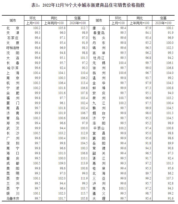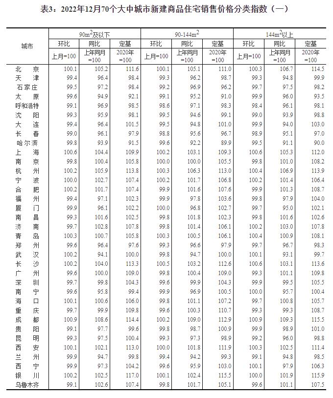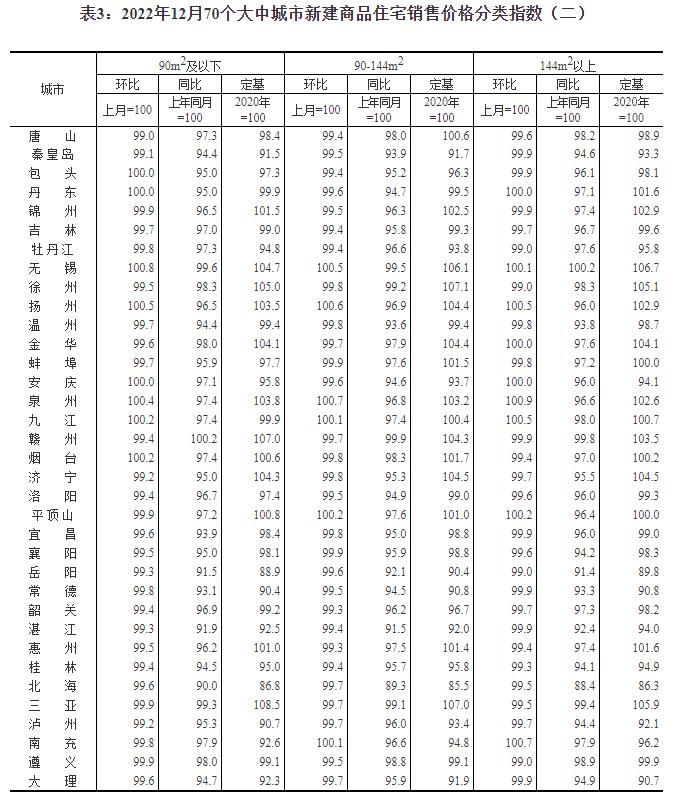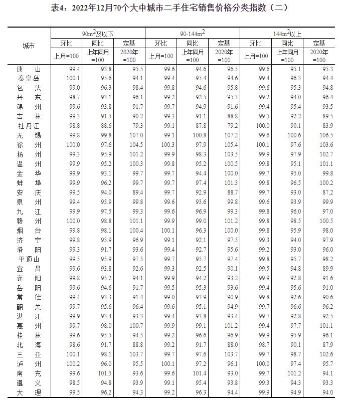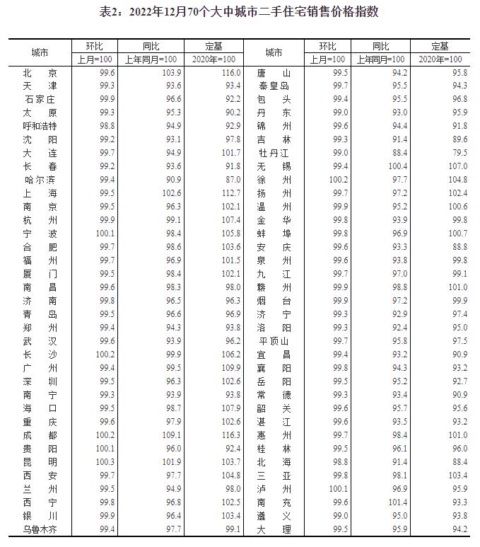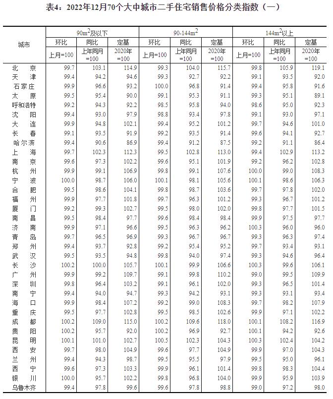 | 2022年12月份,70个大中城市中商品住宅销售价格下降城市个数有所增加,各线城市商品住宅销售价格环比持平或下降,一线城市同比上涨、二三线城市同比下降。 一、一线城市新建商品住宅和二手住宅销售价格环比一平一降,二三线城市环比下降 12月份,70个大中城市中,新建商品住宅销售价格环比下降城市有55个,比上月增加4个;二手住宅销售价格环比下降城市有63个,比上月增加1个。 12月份,一线城市新建商品住宅销售价格环比由上月下降0.2%转为持平;二手住宅销售价格环比下降0.5%,降幅比上月扩大0.1个百分点。二线城市新建商品住宅销售价格环比下降0.3%,降幅比上月扩大0.1个百分点;二手住宅销售价格环比下降0.4%,降幅与上月相同。三线城市新建商品住宅销售价格环比下降0.3%,降幅与上月相同;二手住宅销售价格环比下降0.4%,降幅比上月收窄0.1个百分点。 二、一线城市商品住宅销售价格同比上涨,二三线城市同比下降 12月份,70个大中城市中,新建商品住宅销售价格同比下降城市有53个,比上月增加2个;二手住宅销售价格同比下降城市有64个,个数与上月相同。 12月份,一线城市新建商品住宅销售价格同比上涨2.5%,涨幅与上月相同;二手住宅销售价格同比上涨0.6%,涨幅比上月回落0.6个百分点。二线城市新建商品住宅销售价格同比下降1.1%,降幅比上月收窄0.1个百分点;二手住宅销售价格同比下降3.2%,降幅与上月相同。三线城市新建商品住宅和二手住宅销售价格同比分别下降3.9%和4.8%,降幅均与上月相同。 注释: 70个大中城市房地产价格统计一二三线城市划分:一线城市指北京、上海、广州、深圳等4个城市;二线城市指天津、石家庄、太原、呼和浩特、沈阳、大连、长春、哈尔滨、南京、杭州、宁波、合肥、福州、厦门、南昌、济南、青岛、郑州、武汉、长沙、南宁、海口、重庆、成都、贵阳、昆明、西安、兰州、西宁、银川、乌鲁木齐等31个城市;三线城市指唐山、秦皇岛、包头、丹东、锦州、吉林、牡丹江、无锡、徐州、扬州、温州、金华、蚌埠、安庆、泉州、九江、赣州、烟台、济宁、洛阳、平顶山、宜昌、襄阳、岳阳、常德、韶关、湛江、惠州、桂林、北海、三亚、泸州、南充、遵义、大理等35个城市。 2022年12月份70个大中城市商品住宅销售价格变动情况
