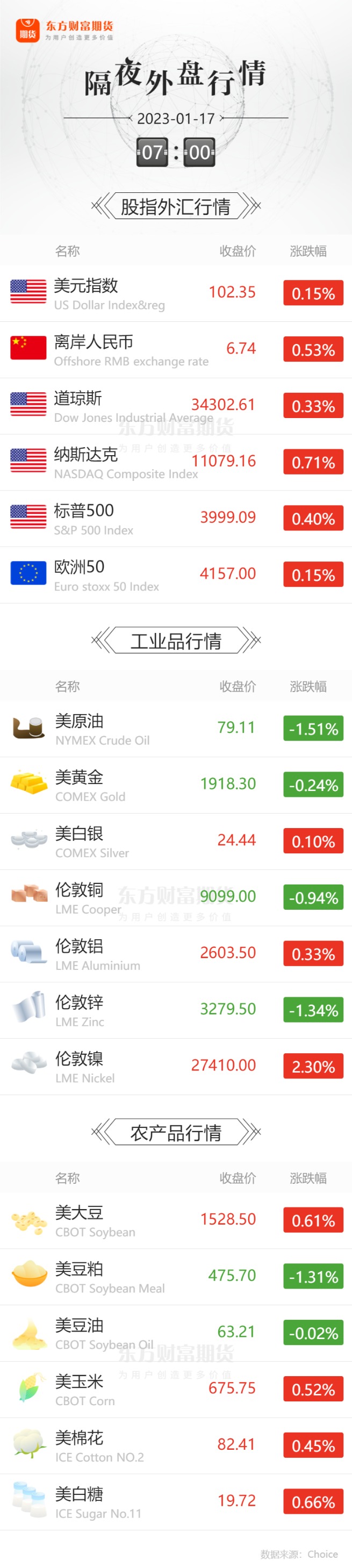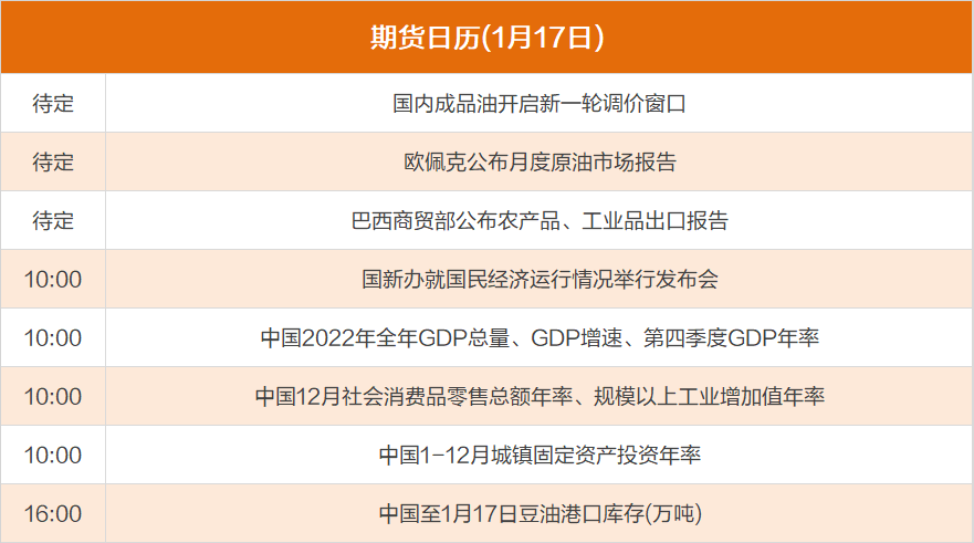 外盘收报![]() 每日精选1、中国2022年GDP增速、人口总量明天揭晓 2、提升中国铁矿石进口安全边际 3、国内多家商品期货交易所公布春节期间市场风控措施 4、中国大豆进口见顶 自给率一年提高3个百分点 宏观产经商务部:中美经贸团队保持良好沟通。为落实两国元首巴厘岛会晤达成的重要共识,加强宏观经济和金融政策协调,刘鹤副总理与耶伦财长将于1月18日在瑞士苏黎世会面。 财政部:《财政部税务总局关于延续实施全年一次性奖金等个人所得税优惠政策的公告》(财政部税务总局公告2021年第42号)中规定的上市公司股权激励单独计税优惠政策,自2023年1月1日起至2023年12月31日止继续执行。《财政部税务总局证监会关于继续执行沪港、深港股票市场交易互联互通机制和内地与香港基金互认有关个人所得税政策的公告》(财政部税务总局证监会公告2019年第93号)中规定的个人所得税优惠政策,自2023年1月1日起至2023年12月31日止继续执行。 第一财经:从昨天开始已有中国驻多国大使馆发文,内容均为:1月17日起,执飞赴华航班的航空公司将负责查验旅客登机前48小时内核酸证明,中国海关将在旅客入境时抽查。包括中国驻美使馆,中国驻加拿大使馆,中国驻日本大使馆,中国驻新加坡大使馆等。自1月8日到现在,从不少国家回国仍会有航空公司在登机前查验旅客的48小时核酸,但从有些国家回国,机场和航空公司已经不检查核酸。而此次中国驻多国使馆发布的通知,意味着对回国登机前查验48小时内核酸阴性报告的要求进行了强化严查。 财政部:财政部发布关于进一步做好新冠疫情防控经费保障,切实加强防控经费管理的通知。通知要求,一、提高政治站位,落实主体责任;二、立足财政职责,做好经费保障;三、强化部门协同,确保政策落地;四、严肃财经纪律,加强资金监管。 央行:为维护银行体系流动性合理充裕,2023年1月16日人民银行开展7790亿元中期借贷便利(MLF)操作和1560亿元公开市场逆回购操作,充分满足了金融机构需求。 统计局:2022年12月份,70个大中城市中商品住宅销售价格下降城市个数有所增加,各线城市商品住宅销售价格环比持平或下降,一线城市同比上涨、二三线城市同比下降。 澎湃新闻:1月16日,人民币对美元即期汇率开盘即升破6.70关口,为半年来首次升破这一关口。同时,更多反映国际投资者预期的离岸人民币对美元汇率也强势升破6.7关口,为去年7月以来首次。进入2023年,人民币对美元即期汇率已经累计升值超过3.6%,离岸人民币对美元汇率也累计升值超过3%。 上海证券报:记者从工商银行上海市分行获悉,该行今日举办支持房地产市场平稳健康发展签约仪式,与沪上16家房地产企业签订《银企战略合作协议》,合作意向性融资总额达2400亿元。根据合作协议,工商银行上海市分行将充分发挥自身优势,积极对接沪上房地产企业金融需求,为房地产企业提供房包括但不限于地产开发贷款、按揭贷款配套、保函、并购贷款等综合化金融服务。 第一财经:1月16日下午,大商所、郑商所和上期所等几家国内期货交易所分别发布通知,对2023年春节期间各期货合约交易保证金标准和涨跌停板幅度作出调整。 品种资讯黑色系&有色系期货 国际金融报:力拓四季度皮尔巴拉铁矿石发货量8730万吨,分析师预期8620万吨;四季度皮尔巴拉铁矿石产量8950万吨;四季度开采铜产量13.13万吨,分析师预期13.8992万吨;2022年全年皮尔巴拉铁矿石发货量3.216亿吨,分析师预期3.203亿吨;维持2023年全年除开采铜之外的产量指引不变。 中钢协:1月上旬,21个城市5大品种钢材社会库存846万吨,环比增加94万吨,上升12.5%,库存上升幅度扩大;比上年同期增加53万吨,上升6.7%。 铁矿石:据Mysteel,1月9日-15日,中国47港铁矿石到港总量2476.9万吨,环比减少109.7万吨;中国45港铁矿石到港总量2370.1万吨,环比减少112.3万吨。 据Mysteel,1月9日-15日,澳洲巴西19港铁矿发运总量2193.8万吨,环比减少73.6万吨。澳洲发运量1778.0万吨,环比减少29.9万吨,其中澳洲发往中国的量1497.4万吨,环比减少38.4万吨。 国家铁路局:国家铁路局日前发布《关于做好铁路货物运输疫情防控和服务保障工作的通知》。其中提出,要督促铁路运输企业做好运输服务保障,积极做好医疗、煤炭、粮食、化肥等物资运输,研判运输保供形势,采取有效应对措施。辖区发生由于疫情等原因影响货运场站运营时,要督促指导企业结合实际采取调整装车站、卸车分流等措施,向客户做好解释工作,全力保障铁路货运畅通。 中国煤炭运销协会:据调度数据,1月上旬,30家煤炭企业焦精煤产销量分别完成533万吨和517万吨,旬度日均产量环比降幅2.5%,同比增幅3.6%。本旬末,30家煤炭企业炼焦精煤库存量191万吨,旬度环比上涨8.0万吨,增幅4.4%,同比上涨16万吨,增幅9.3%。 上海航运交易所:临近春节,电厂日耗有所回落,补库需求减少,市场成交冷清。长江口大雾导致部分区域封航,北上困难,船期普遍延迟,船货双弱,沿海煤炭运价趋于平稳。 财联社:高盛预计,铝的价格将在未来12个月内攀升至每吨3,750美元。高盛分析师写道:“全球可见库存仅为140万吨,较上年同期减少90万吨,且为2002年以来最低,供应缺口的回归将很快引发对稀缺的担忧。在更为良性的宏观环境下,随着美元逆风消退和美联储加息周期放缓,我们预计价格上行势头将逐步积聚到春季。” 农产品期货 农业农村部:1月16日,中央农