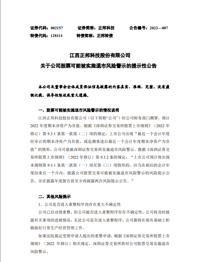 | 百亿猪企正邦科技(SZ002157,股价4.11,总市值130.9亿元)爆雷了。 1月17日晚间,百亿上市猪企正邦科技突然公告,公司股票可能被实施退市风险警示。今天股价会有什么反应呢? 百亿猪企正邦科技暴雷 1月17日,猪企正邦科技发布关于公司股票可能被实施退市风险警示的提示性公告。 ![]() 经正邦科技财务部门测算,预计2022年度期末净资产为负值。根据相关规定,公司可能被深交所实施退市风险警示。同时,正邦科技已启动预重整,但公司能否进入重整程序存在不确定性。如果法院裁定受理申请人提出的重整申请,根据相关规定,深交所将对公司股票交易实施退市风险警示。 正邦科技还指出,如果法院正式受理对公司的重整申请且重整顺利实施完毕,将有利于改善公司的资产负债结构,推动公司回归可持续发展轨道;但即使法院正式受理重整申请,后续仍然存在因重整失败而被宣告破产并被实施破产清算的风险。如果公司因重整失败而被宣告破产,则根据相关规定,公司股票将面临被终止上市的风险。 同日,正邦科技还公告,收到法院延长预重整期限决定书,决定延长正邦科技股份有限公司预重整期间至2023年4月22日。公告显示,此前南昌中院于2022年10月24日作出决定,对正邦科技启动预重整。2023年1月11日,正邦科技预重整临时管理人以正邦科技系上市公司,资产较多、情况复杂,且预重整期间涉及春节假期,临时管理人尚需对正邦科技资产开展详细调查及梳理等原因,向南昌中院提交延长正邦科技预重整期限的申请。南昌中院认为,正邦科技临时管理人的申请符合相关规定。 截至最新数据,正邦科技的股东户超20万。这一夜,部分投资者已经辗转难眠了。 ![]() 去年销售收入同比下滑,发改委三级预警 不过,正邦科技爆雷也是意料之中的事情。 1月9日晚间正邦科技公告,2022年1-12月,该公司累计销售生猪844.65万头,同比下降43.41%;累计销售收入89.54亿元,同比下降达69.87%。正邦科技坦言,2022年1-12月,公司生猪销售数量及销售收入同比降幅较大主要是由于公司出栏规模缩小及生猪出栏价格波动所致。 在猪价大幅下滑的2022年12月,正邦科技销售均价也环比出现大幅下降。 数据显示,正邦科技12月份销售生猪48.71万头(其中仔猪27.86万头,商品猪20.85万头),环比上升64.67%,同比下降39.51%;销售收入6.67亿元,环比上升29.86%,同比下降48.34%。商品猪(扣除仔猪后)销售均价18.86元/公斤,较上月下降17.82%;均重136.67公斤/头,较上月上升8.79%。 2022年销售收入同比下降的不仅有正邦科技。1月9日晚间金新农(002548)披露,该公司2022年1-12月累计销售生猪125.64万头,累计销售收入18.19亿元,分别比去年同期增长17.55%、-10.71%。 经历了三季度的大幅拉涨,2022年10月份全国生猪均价一度突破26元/公斤的关口,进入《完善政府猪肉储备调节机制做好猪肉市场保供稳价工作预案》确定的过度上涨一级预警区间。然而经过2022年四季度以来的持续走弱,1月19日国家发改委官微显示,据国家发展改革委监测,1月3日-6日,全国平均猪粮比价为5.93:1,进入过度下跌三级预警区间。 据中国养猪网数据显示,1月18日,生猪(外三元)为15.17元/公斤,16日一度跌至14.4元/公斤,而去年10月20日曾创下28.59元/公斤高点;而生猪(内三元)14.77元/公斤,阶段低点为14.03元/公斤,去年10月20日曾创下28.12元阶段新高。 ![]() ![]() 数据来源:中国养猪网 据证券时报报道,卓创分析师李素杰表示,李素杰认为,从供应端来看,1月份正值春节放假前后,养殖端有7-10天停售状态,因此日均销售压力仍不减,月初部分养殖场出栏量环比增加。同时散户仍存有部分年猪待春节前出售,因此中上旬出栏量仍或较为充足,下旬正值春节期间,交投寡淡。 从需求端来看,上旬处于春节前备货期,随着消费信心的提升以及灌肠消费旺季的后移,1月份下游白条订单或增幅明显,屠宰企业宰量提升加速,开工率或增幅较大,一定程度支撑猪价上涨。随着备货期结束,需求进入平淡期,下旬猪价下跌的概率较大。 中信建投表示,近期猪价持续下跌至全行业成本线以下,由于当前大猪供应过剩,春节前已无法将过剩供给出清,春节后多余的产能泡泡势必通过分割入库进行消化;周末国家发改委亦建议屠宰企业适当增加商业库存。对于屠企而言,分割入库的条件首先是毛猪价格要有足够吸引力,并有足够的人力和财力作支撑,因此春节后大猪价格预计进一步走低,而这或将对标猪价格形成压制,同时考虑到春节后属于传统消费淡季,节后猪价在一段时间内处于成本线以下的概率较大。 猪肉大幅降价!过年大口吃肉? 据央视财经12日报道,猪肉是老百姓菜篮子里的主要产品,近一段时间猪肉价格发生了哪些变化? 在北京新发地农产品批发市场猪肉销售大厅,商户告诉记者,去年12月份至今,猪肉价格整体呈现波动下行的走势,降幅较大。 北京新发地市场猪肉商户杨琴:排骨现在一斤卖到17元,五花肉一斤卖到13元,比前一个月一斤下降5元左右。