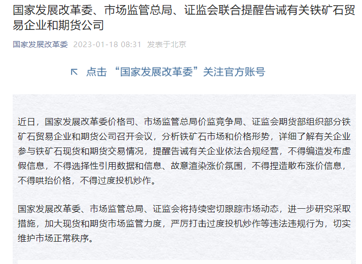 国家发展改革委、市场监管总局、证监会联合提醒告诫有关铁矿石贸易企业和期货公司
