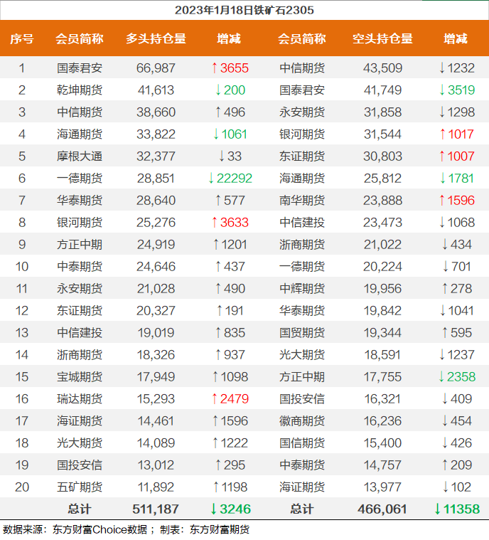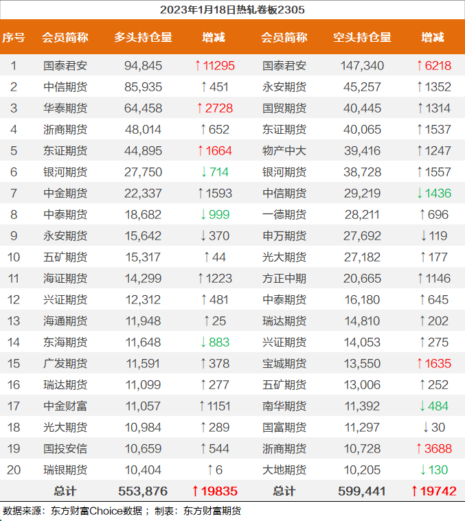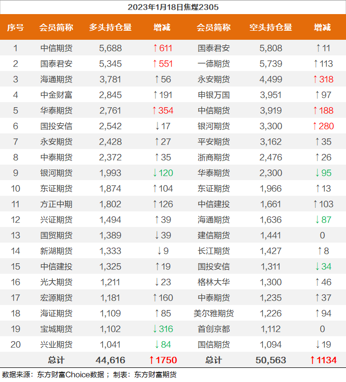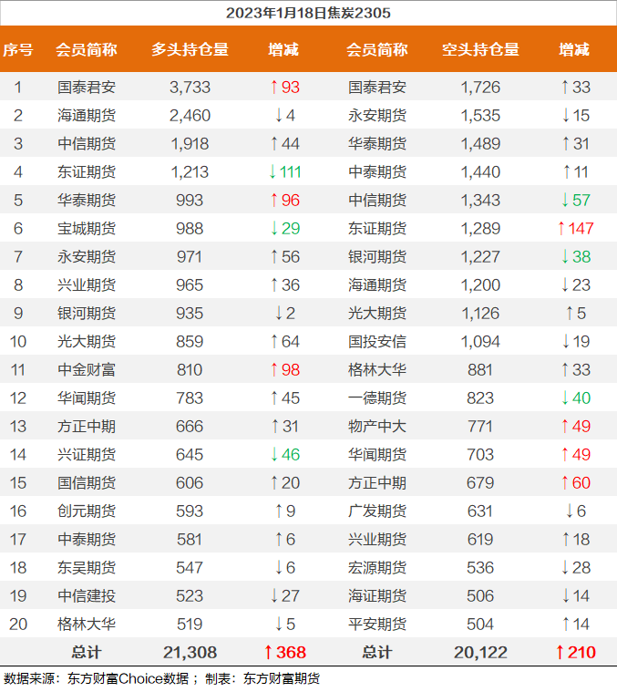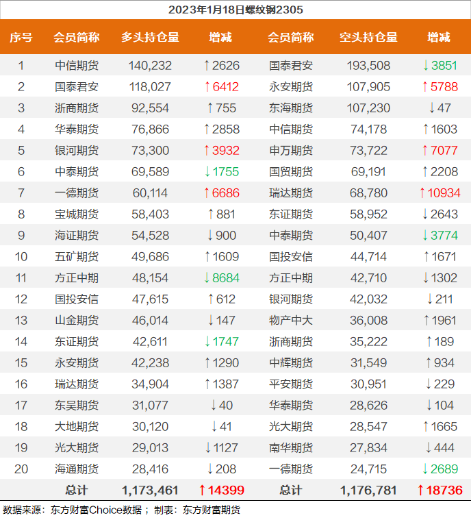 | 截至1月18日收盘,螺纹钢2305收4165/吨,涨1.54%;热卷2305收4196元/吨,涨1.45%;铁矿石2305收841.5元/吨,涨0.9%;焦炭2305收2877/吨,涨1.41%;焦煤2305收1892元/吨,涨1.99%。 螺纹钢2305合约前20席位多单增仓14399手至117.3万余手,空单增仓18736手至117.6万余手,整体呈净空3320手。其中,瑞达期货多单增持1387手,空单增持10934手,整体呈净空33876手。 各品种具体如下: ![]() 各品种持仓情况具体如下: