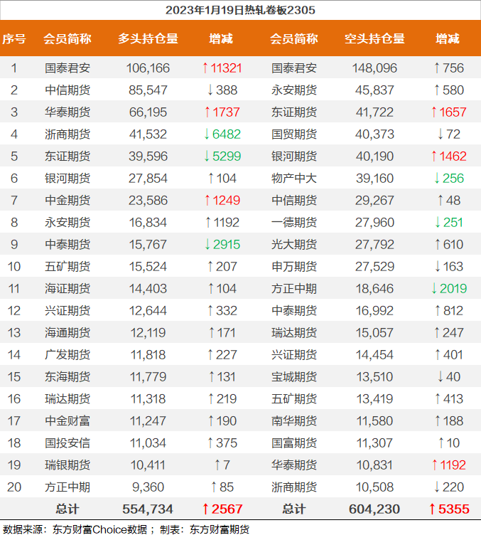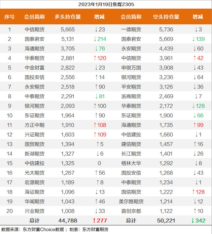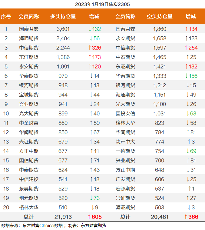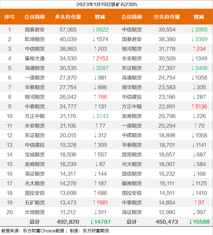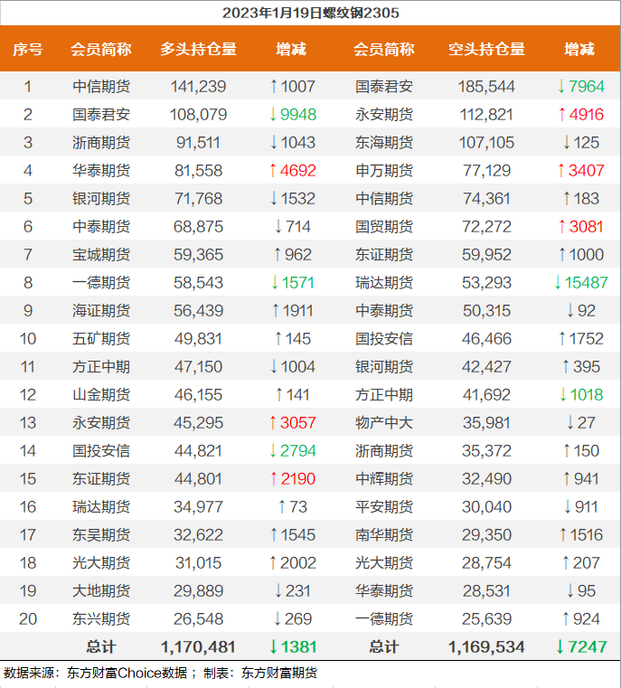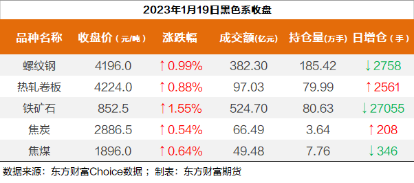 | 截至1月19日收盘,螺纹钢2305收4196/吨,涨0.99%;热卷2305收4224元/吨,涨0.88%;铁矿石2305收852.5元/吨,涨1.55%;焦炭2305收2886.5/吨,涨0.54%;焦煤2305收1896元/吨,涨0.64%。 螺纹钢2305合约前20席位多单减仓1381手至117万余手,空单减仓7247手至116.9万余手,整体呈净多947手。其中,瑞达期货多单增持73手,空单减持15487手,整体呈净空18316手。 各品种具体如下: ![]() 各品种持仓情况具体如下: