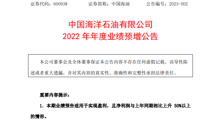 | 1月19日,中国石油(601857)、中国海油(600938)晚披露业绩预告。 在油价持续高位的2022年,两家公司将迎来连续第二年的业绩大幅增长,归母净利润双双冲上1400亿元的历史级规模。目前,机构普遍看多2023年国际油价走势,中国石油集团、中国海油集团在年度工作会议上,也表达了进一步巩固提升良好发展势头的决心。 中国石油业绩预告显示,公司预计2022年年度实现归属于母公司股东的净利润(简称“归母净利润”)1450亿元到1550亿元,与上年同期相比,将增加528亿元到628亿元,同比增长57%到68%。 ![]() 1500亿左右的净利润规模惊人,据统计,这应是过去20年来,中国石油最高的归母净利润规模。2005年至2014年,中国石油归母净利润曾连续十年保持在千亿以上,在2010年,达到了1398.71亿元的峰值。 中国石油表示,2022年,公司坚持低成本发展,主要成本费用指标得到有效控制,同时得益于国际原油价格上涨及提质增效工作深入推进,公司年度经营效益同比大幅增长。 此外,中国石油提出2022年的工作亮点还包括:加大勘探开发力度,积极推动油气增储上产,油气产量保持增长;国内柴油、天然气、化工产品销量同比增长;坚持绿色低碳转型,风光发电、地热等新能源业务稳步拓展。 中国海油的业绩增幅则更加亮眼,中国海油预计2022年全年度实现归母净利润为1396亿元到1436亿元,同比增加约99%到104%。业绩翻倍的亮丽表现,建立在中国海油历史最好的业绩基数上,2021年中国海油净利润703亿元,是公司历史最好水平。 ![]() 中国海油表示,2022年公司抓住油价上涨机遇期,坚持稳中求进总基调,扎实推进油气增储上产、提质增效升级工作,进一步巩固成本核心竞争力,提升价值创造能力,盈利水平同比大幅提升。 回顾2022年,“俄乌冲突”是2022年能源关键词,上半年国际油价基本稳定于100美元/桶以上,最高曾冲至130美元/桶的高位,虽然在年末回落至约80美元,不过仍是2014年以来的价格高位。 在A股市场,石油石化行业2022年度整体表现优于大盘。2022年全年中信油石化板块下跌约9%,但跑赢沪深300指数约10个百分点,其中石油开采子板块股价表现较好。 展望2023年,机构普遍仍看多全球原油价格。摩根大通对全球原油价格预测为90美元,其中一季度为85美元,在四季度达到95美元左右;国泰君安认为,布油全年保持在90-100美元/桶的中枢,走势格局为全年保持在90-100美元/桶的中枢;华福证券认为2023年油价中枢在80美金/桶,走势格局同样为前低后高。 整体来看,机构普遍认为,在供给端,企业资本投入意愿低,决定了全球上游供给增长乏力的态势将越发凸显。在需求端,中国市场的恢复情况,将决定2023年全球油价走势的高度。民生证券指出,2023年原油需求或将增加150万桶/日,中国将是主要的增长动力,预计中国的原油需求增长将达到67万桶/日。 日前,中国石油集团、中国海油集团均召开年度工作会议,表达了巩固提升良好发展势头的决心。 中国海油集团公司总经理李勇在公司2022年开发生产工作会议上表示,坚定不移实施国内油气增储上产“七年行动计划”,实现公司油气产量和经营效益再上新台阶。中国石油2023年工作会议上提出,2023年生产经营工作的9大方面,其中包括强化增储上产,巩固提升油气新能源板块良好发展势头。 (文章来源:证券时报·e公司) (责任编辑:admin) |