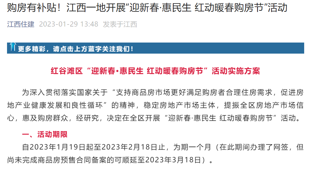 | 春节假期刚过,又有城市传出楼市利好消息。 1月29日,有消息称,郑州部分银行首套房贷利率宣布下调,最低降至3.8%。证券时报·券商中国记者第一时间致电多家银行进行求证,其中,建行、招行郑州某支行的工作人员均向记者证实首套房贷利率已降至3.8%。 同日,“江西住建”微信公众号发文称,江西一地开展“迎新春·惠民生红动暖春购房节”活动,优惠政策包括购房补贴、促销奖励等。 近日,广东、辽宁、江苏等多省表示今年将大力支持住房消费。其中,广东省住建厅党组书记张勇表示,今年要积极支持刚性和改善性住房需求,为以旧换新、以小换大、生育多子女家庭住房消费提供便利。按规定落实个人购买住房契税及换购住房个人所得税优惠政策。辽宁、江苏两省则在稳经济文件中提出多项购房支持政策。 业内人士认为,2023年住房消费提振工作会提速,也有助于进一步带动房地产市场走出低谷。 郑州部分银行首套房贷利率最低3.8% 1月29日,有消息称,郑州部分银行首套房贷利率宣布下调,最低降至3.8%。中原银行郑州分行工作人员向记者确认,当日收到通知将下调首套房贷利率至3.8%,并于当日起执行。 对此,1月29日记者第一时间致电多家银行进行求证,其中,建行、招行郑州某支行的工作人员均向记者证实首套房贷利率已降至3.8%,中行、交行郑州某支行的工作人员则表示,目前未接到利率调整的正式通知文件。 建行郑州某支行的工作人员表示,当天刚接到通知,首套房贷利率调整为最低3.8%。 中行郑州某支行的工作人员对记者称,首套房贷利率下调是大概率事件,但目前还没接到正式书面通知。 “我们也看到新闻了,但是目前没接到上级部门正式通知。”交行郑州某支行的工作人员对证券时报·券商中国记者说。 对于郑州房贷政策调整,上海易居房地产研究院研究总监严跃进认为,部分银行虽然还没有收到通知,但预计1月底都会执行此类政策。郑州打响了新年“降利率”的第一枪,信号意义非常强,有助于降低首套房购房成本。 广东省城规院住房政策研究中心首席研究员李宇嘉认为,郑州房价跌幅居前,新房、二手房价格指数连续下跌17个月,同比下跌11个月,而且跌幅居前,市场信心非常疲软,符合央行关于动态调整首套房利率的规定,此次调整符合预期。 江西一地开展暖春购房节活动 1月29日,“江西住建”微信公众号发文称,江西一地开展“迎新春·惠民生红动暖春购房节”活动。 ![]() 活动具体内容包括: (一)购房补贴。自2023年1月19日起至2023年2月18日止,凡在红谷滩区购买新建商品房,且完成合同备案的购房人,可享受200元/平方米的购房补贴(单套商品房最高不超过4万元)。活动期间购房,且在具备交房条件后6个月内缴清契税的购房人,按购房总价(以开票金额为准)的1%给予契税补贴(单套商品房最高不超过4万元)。 (二)促销奖励。在让利惠民的原则下,房地产企业制定实施新春优惠促销方案(不低于政府政策补贴),并在销售中心公示,区政府对活动期间住宅销售套数超过20套以上及非住宅销售面积超过2000平方米以上的房地产开发企业,根据网签备案数据进行评定排名,并按排名情况给予以下奖励: ![]() 多省今年将大力促进住房消费 近日,广东、辽宁、江苏等多省表示今年将大力支持住房消费。 1月28日,广东全省高质量发展大会召开,其中第五分论坛主题为“推动房地产业平稳健康发展”,省住建厅党组书记张勇在会上表示,要全力稳定市场预期,坚持房子是用来住的、不是用来炒的定位,保持房地产各项政策连续性、稳定性,以更大力度、更多优惠、更小成本精准支持合理住房需求,努力保持房地产供需基本平衡、结构基本合理、价格基本稳定,严控投机炒房,确保实现稳地价、稳房价、稳预期。 张勇表示,今年将大力促进住房消费。因城施策实施好差别化住房信贷政策,积极支持刚性和改善性住房需求,为以旧换新、以小换大、生育多子女家庭住房消费提供便利。按规定落实个人购买住房契税及换购住房个人所得税优惠政策。 1月27日,辽宁省发布《辽宁省进一步稳经济若干政策举措》,提出9方面共27条举措。其中,在推动消费复苏回暖方面提出,鼓励合理住房消费。鼓励二手房交易与新建商品房销售享受同等补贴支持政策。落实非住宅类商品房去库存支持政策,对购买非住宅商品房实际用于居住用途且为首套刚需的,水电气暖等收费价格参照住宅标准执行。对抵押银行的二手房,在交易时可以“带押过户”,不用提前还贷即可办理过户。 1月16日,江苏省发布《关于推动经济运行率先整体好转的若干政策措施》,提出12方面共42条措施。其中,在促进房地产市场平稳健康发展方面提出,因城施策用足用好房地产调控政策工具箱,调整优化限制性政策和土地出让政策,大力支持刚性和改善性购房需求,坚持“房住不炒”,认真落实居民个人换购住房个人所得税政策。根据实际情况调整公积金贷款政策,完善征收拆迁安置补偿方式,优化商品房价格备案制度。 (文章来源:券商中国) (责任编辑:admin) |