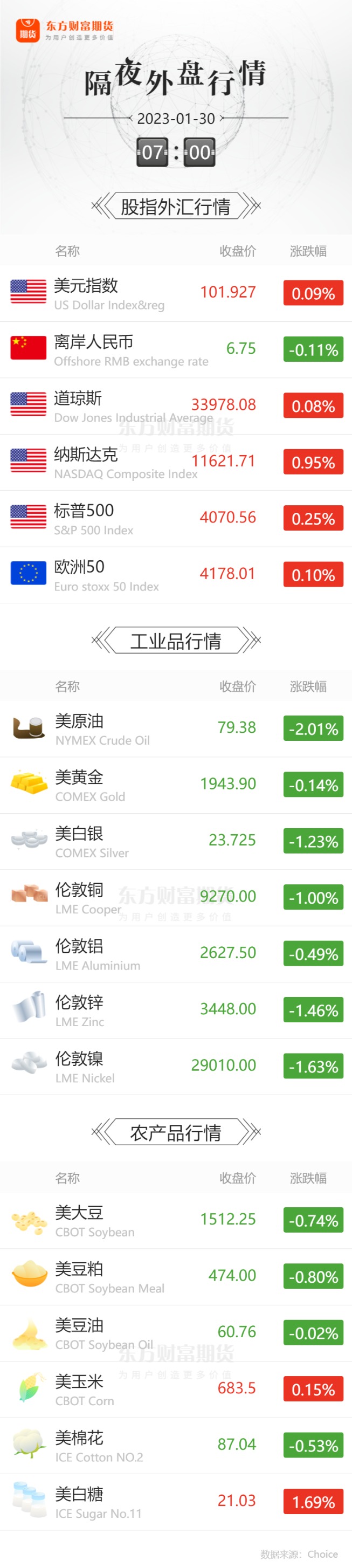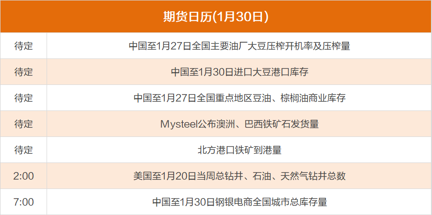 外盘收报![]() 每日精选这些商品异军突起!“中国主导力” 后市被看好 中信建投2023年大类资产十大预测:A股或在全球衰退中走出独立行情 【首席展望】广发证券王乾:农产品价格易涨难跌对养殖不悲观 美国四季度GDP增速强于预期 对“软着陆”的信心重返市场 宏观产经证券时报:1月28日,据央视新闻,国务院总理李克强28日主持召开国务院常务会议,要求持续抓实当前经济社会发展工作,推动经济运行在年初稳步回升;部署做好春耕备耕工作,为粮食丰收和重要农产品稳定供应打牢基础;要求推动消费加快恢复和保持外贸外资稳定,增强对经济的拉动力。 界面新闻:国家发展改革委等部门发布《关于推动大型易地扶贫搬迁安置区融入新型城镇化实现高质量发展的指导意见》。其中提出,推进有序落户城镇。充分尊重搬迁人口落户城镇意愿,因地制宜制定具体落户办法,提高户籍登记和迁移便利度,鼓励支持有条件有意愿的搬迁群众进城落户。积极稳妥推广新市民居住证制度,推动城镇基本公共服务逐步覆盖未落户搬迁人口。依法保障已落户城镇的搬迁群众在迁出地农村的合法权益。 交通运输部:1月28日,交通运输部召开领导干部会议,部长李小鹏强调,要科学制定有效实施加快建设交通强国2023—2027年行动计划。科学精准抓好疫情防控交通运输工作。强化交通物流保通保畅工作。牢牢守住交通运输安全发展底线。积极扩大交通有效投资。提升交通运输服务质量和水平。支撑引领区域城乡协调发展。加快建设统一开放的交通运输市场。推动交通运输创新驱动发展。推动交通运输清洁低碳转型。 人民日报:1月25日,中国疾病预防控制中心官网发布全国新型冠状病毒感染疫情情况,在2022年12月22日前后,感染人数、发热门诊诊疗人数达到峰值。感染人数每日最多新增超700万,发热门诊诊疗人次最高峰每日286.7万,重症患者数量最高峰每日增量近1万,死亡病例数于1月4日达到每日峰值4273例。 证券时报:江苏省政府近日发布《关于推动经济运行率先整体好转的若干政策措施》,其中包括诸多改善社会心理预期、提振发展信心的务实举措。其中包括:对月销售额10万元以下(含本数)的增值税小规模纳税人,免征增值税;根据实际情况调整公积金贷款政策的同时,全力以赴保交楼,切实维护购房者利益。 财联社:周四(1月26日)美股盘前,美国商务部经济分析局公布的最新数据显示,去年第四季度经济增速小幅放缓但强于预期。具体数据显示,美国2022年第四季度实际国内生产总值(GDP)初值年化环比上升2.9%,较上一季度的3.2%放慢了0.3个百分点,但高于市场此前预期的2.6%。与其他国家不同,美国将实际GDP年化季率作为最通用的衡量经济增长的指标,因认为其更能反映出经济的趋势。 上海市人民政府:促进汽车、家电等大宗消费。延续实施新能源车置换补贴,2023年6月30日前个人消费者报废或转出名下在上海市注册登记且符合相关标准的小客车,并购买纯电动汽车的,给予每辆车10000元的财政补贴。实施绿色智能家电消费补贴,对消费者购买绿色智能家电等个人消费给予支付额10%、最高1000元的一次性补贴。 央视新闻:金砖国家新开发银行副行长莱斯利·马斯多普在接受中央广播电视总台记者专访时表示,诸多机构已经上调对中国2023年经济增长的预测,中国优化防疫措施后,国际金融机构普遍看好中国经济的发展前景。 经济日报:1月20日,今年首期贷款市场报价利率(LPR)出炉。中国人民银行授权全国银行间同业拆借中心公布,1年期LPR为3.65%,5年期以上LPR为4.3%。这已是LPR在2022年8月下降之后,连续5个月保持不变。业内人士认为,LPR持稳不影响实体经济融资成本持续下行势头。接下来,仍应采取多方面措施降低实体经济融资成本,进一步激发有效融资需求,促进经济社会全面恢复。 品种资讯黑色系期货 中钢协:1月中旬,21个城市5大品种钢材社会库存929万吨,环比增加83万吨,上升9.8%,库存继续上升:比年初增加177万吨,上升23.5%;比上年同期增加55万吨,上升6.3%。 钢谷网:1月27日中西部&全国钢材库存调研统计:全国建材社库899.09万吨,较上周增加191.52万吨,上升27.07%;厂库621.15万吨,较上周增加159.44万吨,上升34.53%;产量368.48万吨,较上周增加1.02万吨,上升0.28%;中西部建材:社库378.63万吨,较上周增加101.72万吨,上升36.73%;厂库252.70万吨,较上周增加55.44万吨,上升28.11%;产量127.37万吨,较上周增加5.42万吨,上升4.44%。 铁矿石:据Mysteel,1月16日-1月22日中国47港到港总量2586.5万吨,环比增加109.6万吨;中国45港到港总量2480.1万吨,环比增加110.1万吨;北方六港到港总量为1160.8万吨,环比减少93.3万吨。 据Mysteel,1月16日-1月22日澳洲巴西19港铁矿发运总量2408.5万吨,环比增加214.6万吨。澳洲发运量1843.7万吨,环比增加65.6万吨,其中澳洲发往中国的量1571.0万吨,环比增加73.6万吨。巴西发运量564.8万吨,环比增加149.0万吨。 界面新闻:花旗集团1月26日将三个月期铁矿石价格预期下调至120美元/吨,预计由于防疫措施的调整,以及钢铁需求没有明显回升,铁矿石价格大涨约30%后将放缓。 中国新闻网:记者24日从山西省应急管理厅获悉,山西省政府日前出台《关于做好2023年安全生产工作的通知》,这是自2009年起,山西省政府连续15年以“一号文件”安排部署安全生产工作。《通知》指出,突出重点行业领域,持续深化煤矿、金属非金属矿山和尾矿库、危险