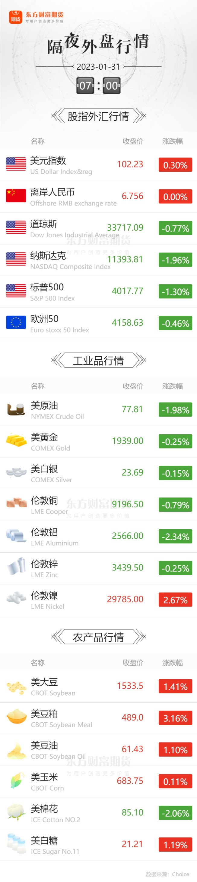 外盘收报![]() 每日精选发改委:猪粮比价进入过度下跌二级预警区间 8000万铝货“人间蒸发” 期货风险管理子公司被“坑”出阴影仓单“一女多嫁”为何总能得手? 全球镍业再临风暴!第二大镍矿供应国计划限制原矿石出口 大面积“破7”!猪价现“开工跌” 业内分析短期供应压力仍存 2023年首个央行超级周来袭:美欧英央行面临同一个“敌人”? 宏观产经界面新闻:四川卫健委发布《四川省生育登记服务管理办法》,自2023年2月15日起施行,有效期五年。《办法》取消了对登记对象是否结婚的限制条件,将生育登记的重心转移到生育意愿和生育结果上来,回归人口监测及生育服务本位。 央视新闻:今天(1月30日),国务院联防联控机制举行新闻发布会。国家卫健委新闻发言人米锋介绍:春节期间,国务院联防联控机制相关部门持续做好服务保障,广大医务人员和各行业工作者坚守岗位,防控工作平稳有序,“乙类乙管”措施落地见效。目前全国整体疫情已进入低流行水平,各地疫情保持稳步下降态势。 人民日报:外交部发言人毛宁表示,日本驻华使馆已经于1月20日宣布恢复审发中国公民的赴日签证,日前,中方恢复审发了日本公民来华签证。我们一贯坚决反对将疫情防控政治化,认为应当取消针对中国的限制性、歧视性限制措施,我们愿同各方一道为中外人员的正常往来创造更多的便利。 证券时报:近日,国家铁路局、工信部、中国国家铁路集团有限公司联合印发了《关于支持新能源商品汽车铁路运输服务新能源汽车产业发展的意见》。意见提出,积极鼓励铁路运输企业开展新能源商品汽车铁路运输业务,对纳入工信部《道路机动车辆生产企业及产品公告》范围,采用锂离子电池驱动的插电式混合动力或纯电动新能源商品汽车,依据法律法规和有关标准,铁路运输新能源商品汽车不按危险货物管理,由承托双方按照本通知要求办理运输。 界面新闻:1月30日,长沙市住房公积金管理委员会网站发布了《关于明确2023年个贷倍数的通知》,通知提出,长沙市缴存职工(含省直分中心)可贷额度按照借款人夫妻双方住房公积金账户余额之和的16倍计算。《通知》自2023年2月1日起施行。 财政部:2022年,全国一般公共预算收入203703亿元,比上年增长0.6%,扣除留抵退税因素后增长9.1%。印花税4390亿元,比上年增长7.7%。其中,证券交易印花税2759亿元,比上年增长11.4%。 品种资讯黑色系&有色系期货 钢银电商:本周城市钢材总库存量为1137.17万吨,较节前环比增加294.73万吨(+34.99%),包含39个城市,共计147个仓库。 国家统计局:2022年12月,中国钢筋产量为1951.7万吨,同比下降4.4%;1-12月累计产量为23762.8万吨,同比下降8.1%。 铁矿石:据Mysteel,1月23日-1月29日中国47港到港总量2528.6万吨,环比减少57.9万吨;中国45港到港总量2434万吨,环比减少46.2万吨;北方六港到港总量为1385.2万吨,环比增加224.3万吨。 据Mysteel,1月23日—1月29日Mysteel澳洲巴西19港铁矿发运总量2158.3万吨,环比减少250.2万吨。澳洲发运量1701.7万吨,环比减少141.9万吨,其中澳洲发往中国的量1428.4万吨,环比减少142.7万吨。巴西发运量456.6万吨,环比减少108.2万吨。全球铁矿石发运总量2573.0万吨,环比减少282.0万吨。 焦煤:据Mysteel,2023年第一船澳洲炼焦煤正驶向中国,1月24日6:48离开澳洲,预计2月8日12:00抵达湛江,基于海运货流监测大数据模型分析,该船预计货量71682吨左右。 界面新闻:据路透社1月30日报道,印度中央电力局(CEA)在1月20日的一份文件中表示,由于电力需求激增,印度已要求公用事业公司在2030年之前不要淘汰燃煤电厂。 财联社:印尼能源和矿产资源部长阿里芬·塔里夫(Arifin Tasrif)周一表示,印尼计划今年生产6.95亿吨煤炭,预计出口5.18亿吨,这意味着该国的煤炭出口量将创纪录。他说,2022年,印尼生产了6.87亿吨煤炭,出口了4.94亿吨。 界面新闻:1月30日,中国五矿集团旗下上市公司五矿资源(01208.HK)公告称,由于运输受阻,公司旗下Las Bambas铜矿关键物资出现短缺,将于2月1日起暂停生产。这将是该铜矿自2021年以来的第三次停产。五矿资源指出,运输受阻主要受秘鲁延续数周的全国示威抗议活动影响。目前,Las Bambas铜矿已调动其矿山安保人员,确保财产安全。 国家统计局:中国2022年12月精炼铜(电解铜)产量为96.1万吨,同比增加3.6%;2022年全年精炼铜(电解铜)产量累计为1106.3万吨,同比增加4.5%。 财联社:综合多家媒体报道,菲律宾政府正在考虑对镍矿石出口征税,以吸引外界对其国内的金属镍加工行业进行投资。当地时间周一(1月30日),菲律宾环境部(DENR)部长安东尼娅·尤洛-洛伊萨加告诉媒体,“在镍供应链中,我们希望不只是担任原矿石出口国,我们想要成为价值链的一部分。” 农产品期货 央视新闻:近日,中央纪委国家监委印发《关于深化粮食购销领域腐败问题专项整治工作的意见》,要求各级纪检监察机关认真贯彻落实党的二十大精神和中央纪委二次全会工作部署,锚定彻底惩治系统性腐败目标任务,保持清醒和坚定,加强组织领导,对专项整治工作进行再动员、再部署,确保机制不变、力度不减、标准不降,切实服务保障国家粮食安全。 国家发改委:据国家发展改革委监测,1月16日~20日当周,全国平均猪粮比价为5.48∶1,连续三周处于5:1~6:1之间,进入《完善政府猪肉储备调节机制做好猪肉市场保供稳价工作预案》设定的过度下跌二级预警区间。 新华财经:据农业农村部监