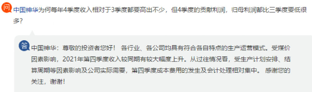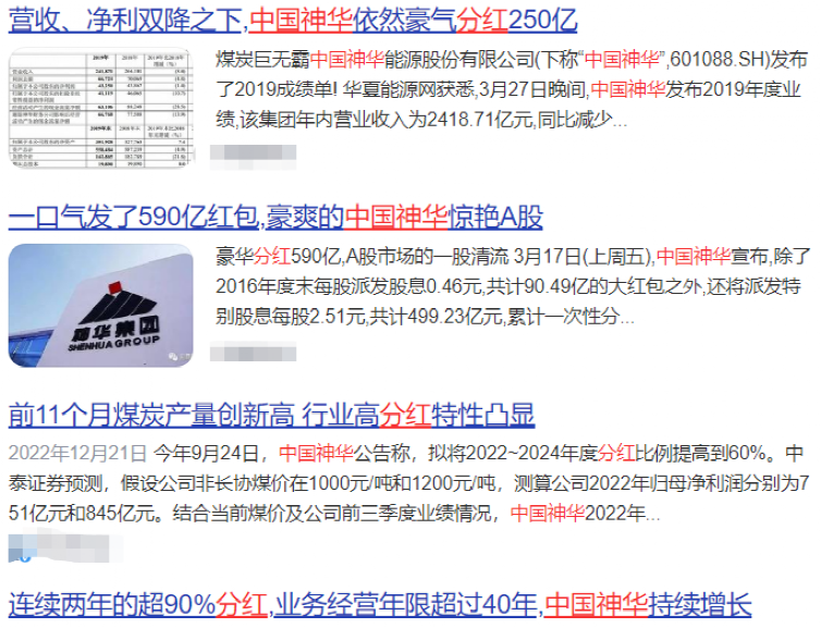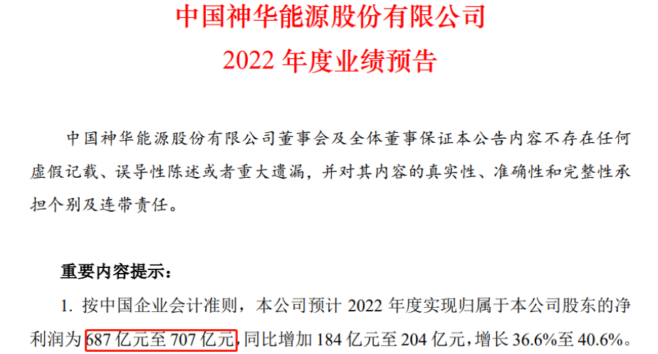| 1月30日晚,市值5500多亿的中国神华发布业绩预告,预计2022年度实现净利润687亿至707亿元,同比增长36.6%至40.6%。 中国基金报记者注意到,这一业绩将创下公司2007年A股上市16年以来的新高。此外,作为A股代表性“分红大户”,中国神华此前两年的现金分红分别为359.62亿元、504.66亿元,占当年净利润的100.4%和91.81%,如果高分红政策延续,以当前股价测算中国神华2022年度分红股息率有望突破10%。 受益于煤价高位运行,2022年煤炭行业企业大面积预增。截至1月30日晚记者发稿,已有23家煤炭企业发布2022年度业绩预告,预增类型达到18家,预增比例近八成,有的甚至实现数倍增长。 三原因造就“史上最强”业绩 中国神华公告称,经公司财务部门初步测算,预计公司2022年度实现中国企业会计准则下归属于公司股东的净利润为687亿元至707亿元,同比增加184亿元至204亿元,增长36.6%至40.6%;预计归属于公司股东的扣除非经常性损益的净利润为694亿元至714亿元,同比增加194亿元至214亿元,增长38.8%至42.8%。 ![]() 2021年度,中国神华归属于公司股东的净利润为502.69亿元,归属于公司股东的扣除非经常性损益的净利润为500.36亿元,基本每股收益2.53元/股。 关于业绩大幅预增的主要原因,中国神华表示,一是积极贯彻落实保障能源供应政策和要求,以煤炭保能源安全,核增煤矿产能,加强生产组织,商品煤产量及售价上升;以煤电保电力稳定,新增投运机组,优化机组运行,售电量和价格增长;强化公司治理,严控成本增长,提升资产质量,煤电运化一体化产业链竞争力持续巩固,经营业绩实现增长。二是平均所得税税率同比下降。三是对联营企业的投资收益同比增长。 不过,中国神华2022年三季报的利润就有591.3亿元,同比增长45%,也就是说去年四季度的净利润为96亿至116亿元,比2021年四季度单季的95亿元增幅在1%至21%区间,远低于去年同期增幅。 此前,也有投资者注意到该问题并在中国神华互动平台提问:为何每年四季度收入相对于三季度高出不少,但四季度的净利润却比三季度要低很多?中国神华回复称,“从过往情况看,受生产计划安排、结算周期等因素影响及公司实际需要,第四季度成本费用的发生及会计处理相对集中”。另外,2021年四季度受煤价因素影响,基数也比较高。 ![]() 股息率有望破10%? 作为A股现金分红的模范生,中国神华近年分红方案公布时都备受市场关注。 ![]() 东方财富choice数据显示,过去10年(2012年以来)中国神华每年的股利支付率(即现金分红占当年净利润的比例)大都在40%以上,2016年更曾高达260%。2019年度至2021年年度,公司承诺的最低分红比例为50%,但实际执行下来这三年的现金分红金额分别为250.61亿元、359.62亿元、504.66亿元,现金分红比例分别达到57.9%、91.8%、100.4%,呈现明显的上升趋势。 ![]() 此前,中国神华披露的《2022-2024年股东回报规划》显示,其保底承诺2022-2024年度现金分红比例60%。如果按最低比例60%测算,2022年度现金分红也在420亿元附近,与最新市值5575亿相比,股息率近8%,而如果其延续前两年的超高分红比例,只要股利支付率不低于80%,按现价计股息率便有望突破10%。 截至 2022 年三季度末公司货币资金量高达1831 亿元,未分配利润高达2690亿元,充裕的现金为公司高分红奠定了基础,再次超高分红条件是具备的。从往年情况看,中国神华的分配方案一般和当年年报一起披露,上交所官网预披露的时间表显示,中国神华计划于2023年3月25日发布2022年年报。 ![]() 值得一提的是,习惯大方分红的中国神华也是一只长牛股,如果每年分红选择再投,从2014年低点算起,到2022年的高点33.35元/股,区间最大收益率超过100倍。 ![]() 近八成煤炭企业报喜 中国神华之外,同在30日晚冀中能源、靖远煤电等多家煤炭企业也发布了业绩预告,大多预增。 靖远煤电公告,公司预计2022年归母净利润31.4亿元,比上年同期(调整后)增长54.78%,预计基本每股收益0.68元/股。报告期内,公司煤炭板块销售均价同比上涨,公司经营效益提升。电力板块平均销售电价上浮,同比减亏。 冀中能源公告,预计2022年归属于上市公司股东的净利润42.2亿元~49.5亿元,同比增长54.05%~80.7%。上海能源公告,预计2022年实现净利润16亿元到19亿元,同比增加12.26亿元到15.26亿元,同比增幅为327.81%到408.02%。 而春节前,陕西煤业、潞安环能、山西焦煤等行业龙头已相继预告去年业绩大幅增长,受益于煤价高位运行,行业企业大面积预增。 ![]() 近两千亿市值的行业龙头陕西煤业也预计收获历史最好业绩。受益于煤炭售价大涨、以及对隆基绿能的投资收益等,陕西煤业预计2022年实现净利润为340亿元到362亿元,同比增加126亿元到147亿元,同比增幅达58%到68%。 兖矿能源预计2022年全年盈利约308亿元,同比增加约145亿元左右,增幅达89%左右。公司表示,2022年以来,受境内外能源价格上涨影响,集团煤炭价格维持高位。 平煤股份预计去年净利润约57.2亿元,较上年同期增加27.98亿元,同比增长95.76%。公司将业绩增长归因于,煤炭行业发展势头良好,煤炭价格处于高位运行,以及公司大精煤战略下,规模效益持续释放。 东财choice数据显示,截至记者发稿,已有23家煤炭行业(申万一级)公司发布业绩预告,预减类型的只有5家,其中亏损的只有安源煤业和安泰集团2家。其他18家已预告企业基本都是大幅预增,占比近80%,其中山西焦煤、华阳股份、山西焦化、潞安环能、盘江股份等2022年净利润