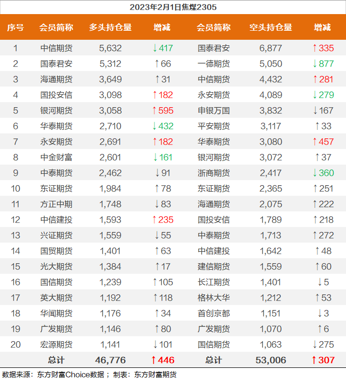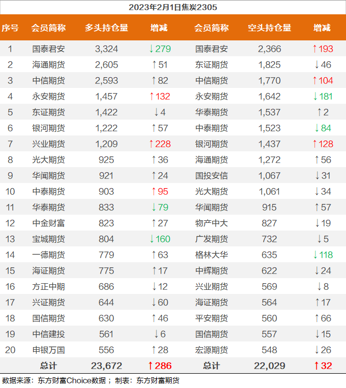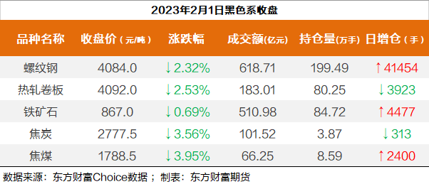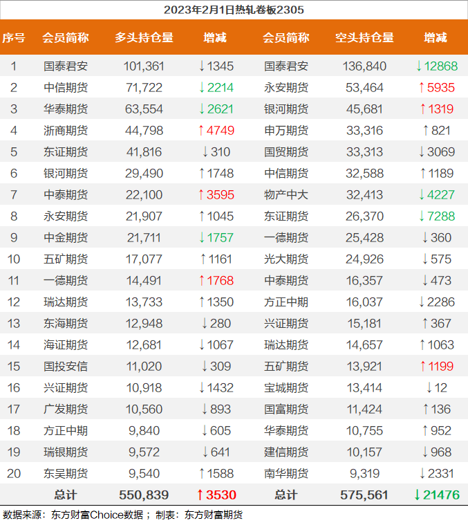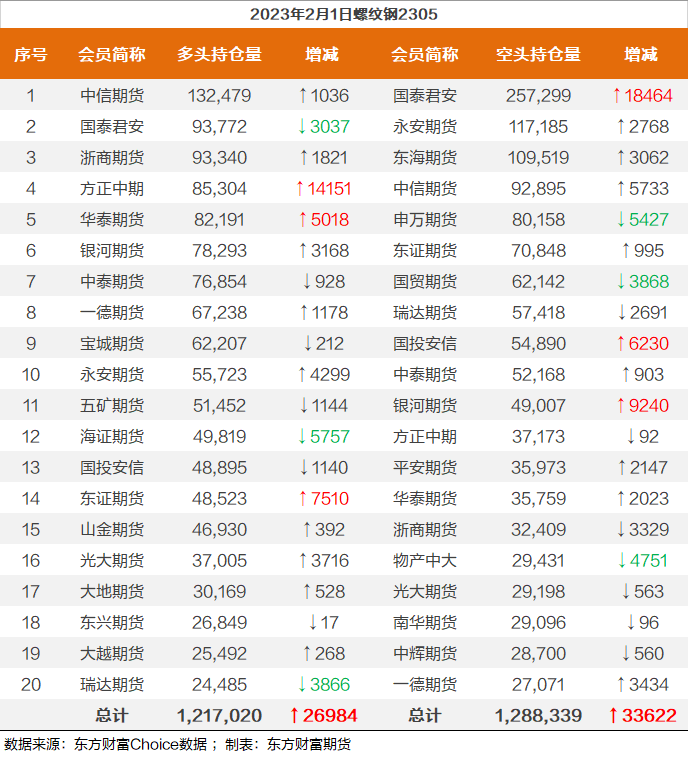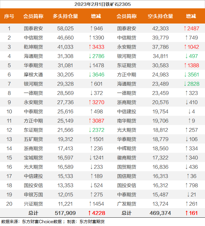 | 截至2月1日收盘,螺纹钢2305收4084/吨,跌2.32%;热卷2305收4092/吨,跌2.53%;铁矿石2305收867元/吨,跌0.69%;焦炭2305收2777.5/吨,跌3.56%;焦煤2305收1788.5元/吨,跌3.95%。 螺纹钢2305合约前20席位多单增仓26984手至121.7万余手,空单增仓33622手至128.8万余手,整体呈净空71319手。其中,国泰君安期货席位多单减持3037手,空单增持18464手,整体呈净空163527手。 各品种具体如下: ![]() 各品种持仓情况具体如下: ![]() ![]() ![]() ![]() ![]() (文章来源:东方财富研究中心) (责任编辑:admin) |