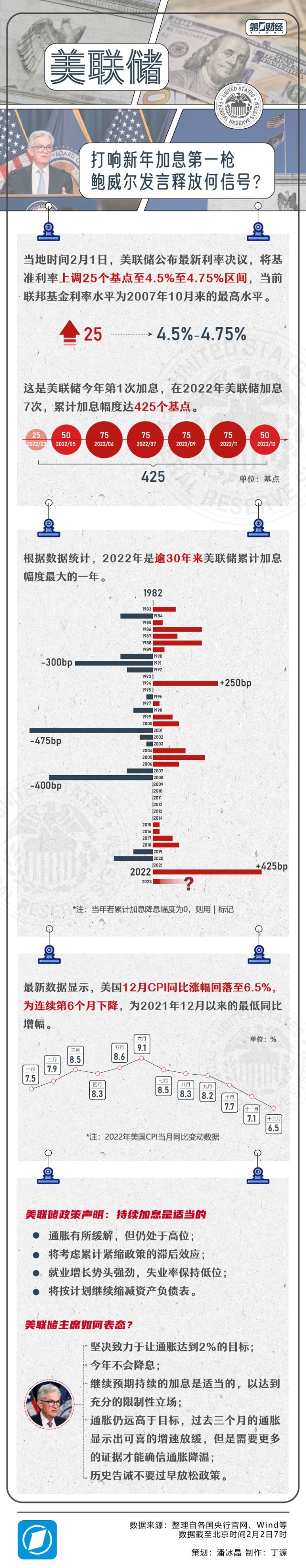 一图看懂:美联储打响新年加息第一枪 鲍威尔发言释放何信号? 第一财经 02月02日 当地时间2月1日,美联储宣布,将联邦基金利率目标区间上调25个基点到4.50%至4.75%之间,去年3月以来美联储已累计加息450个基点。一图速览>>(文章来源:第一财经) (责任编辑:admin)