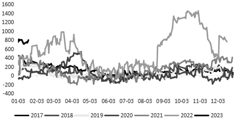 图为豆粕2305合约基差 从需求看,由于今年春节较早,终端备货较往年有所提前,但由于备货心态谨慎,普遍库存水平不高,春节过后仍有补库需求。终端补库节奏仍将决定豆粕库存的修复速度,成为影响短期豆粕现货价格的重要因素。国内低库存、高基差仍是豆粕期价的重要支撑,预计豆粕期价将保持振荡上行趋势。(作者期货投资咨询从业证书编号Z0011311) (责任编辑:admin) |